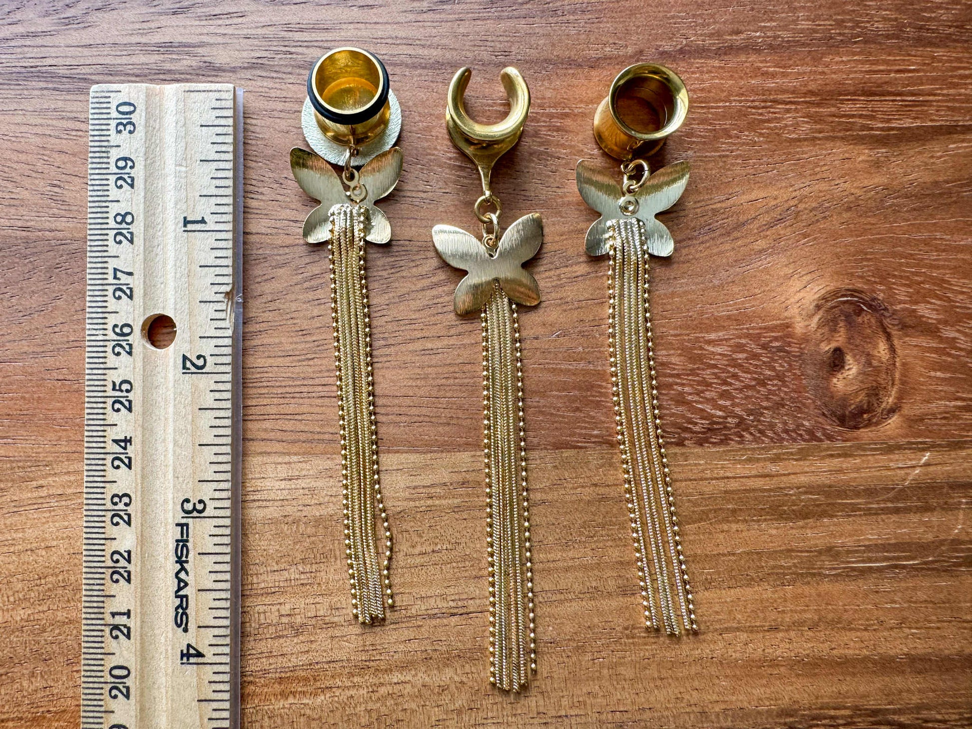 2g (6mm) - 1 3/16 (30mm) 18k Butterfly Tassels Drop Dangle Earrings Gauges/Earplugs Hider Plugs.