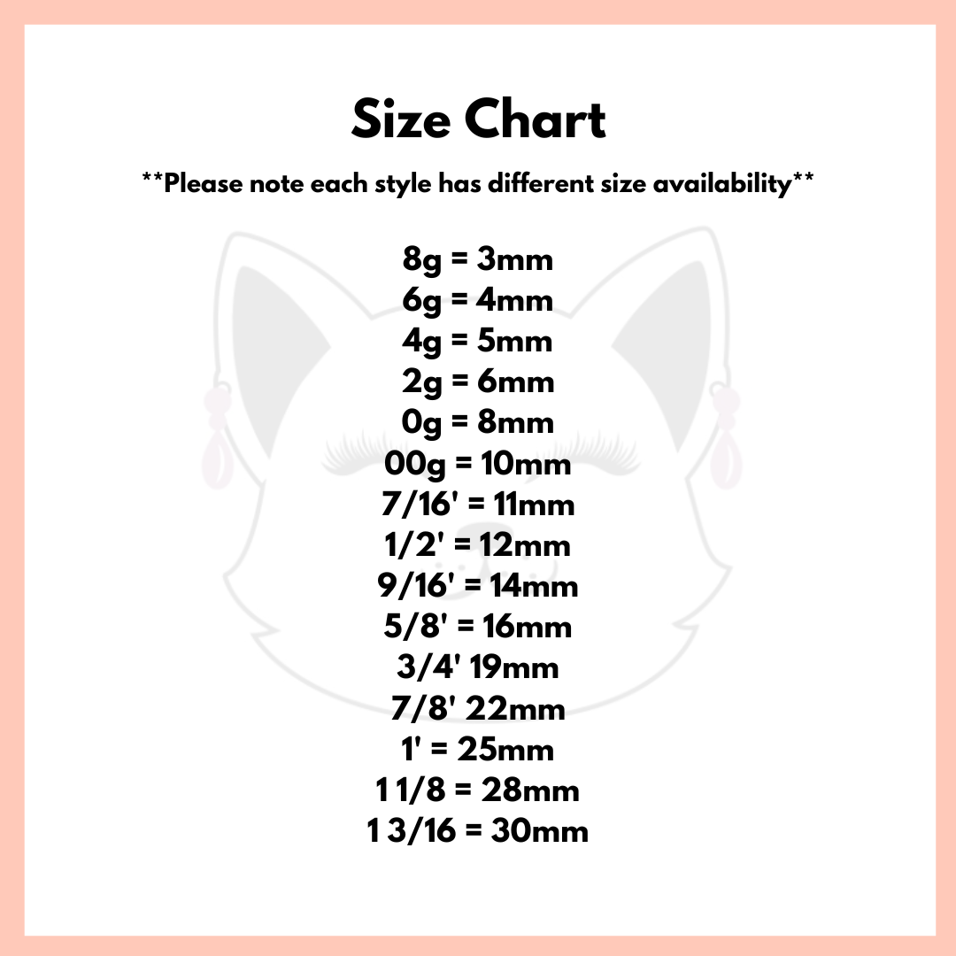 Regarding sizing: Saddles generally run bigger than expected. Why? The size you choose refers to the wearable (inner) area of the saddle where your lobe rests. However, saddles have larger outer widths and heights than typical plugs to help them stay in place- very similar to double flared plugs. See second photo for reference. We ask you keep this in mind when selecting a size as these larger outer areas may be a challenge for some to insert properly. Some may prefer a more fitted look or are intending on continuing their stretching journey while others may want a more looser fit, especially at larger lobe sizes.