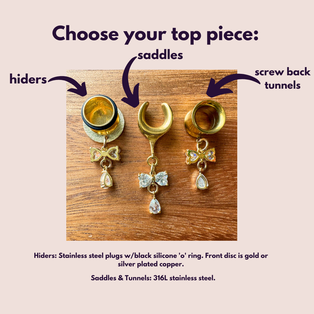 6g (4mm) - 1 3/16 (30mm) 18k Mini CZ Bows Dangle Earrings Gauges/Earplugs Hider Plugs