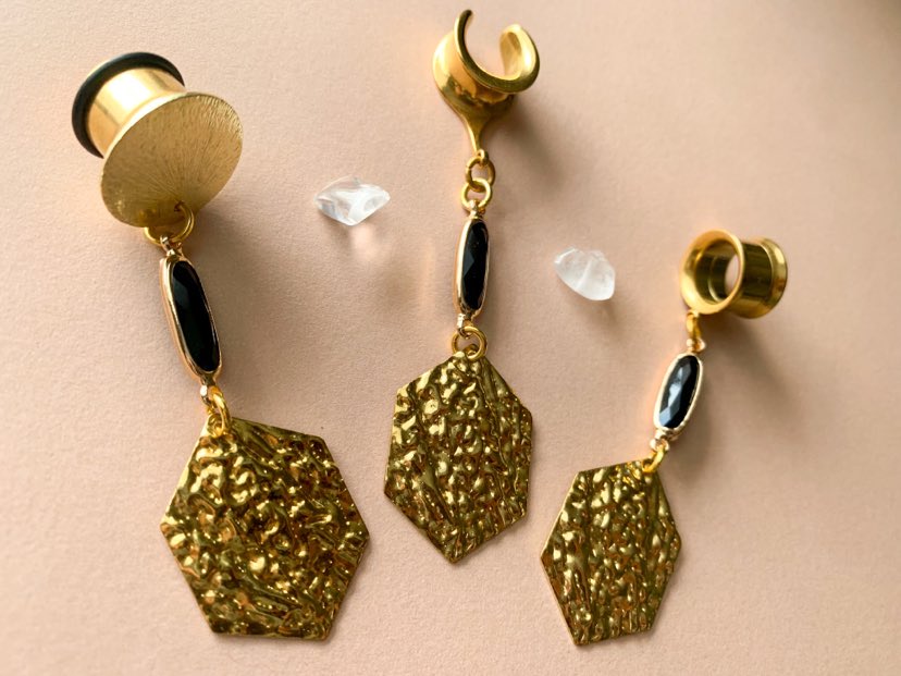 8g (3mm) - 1 5/16" (34mm) Black Glass Jewel w/Hammered Brass Charm Saddles Hiders Drop Dangle Earrings Gauges/Earplugs Plugs.