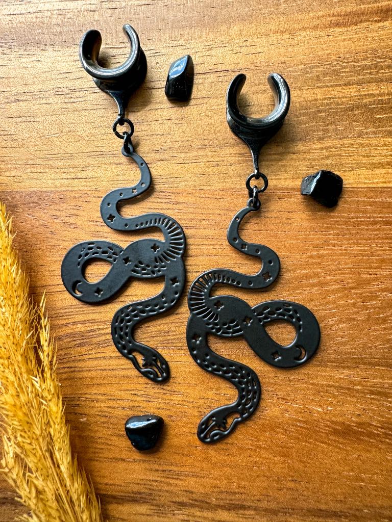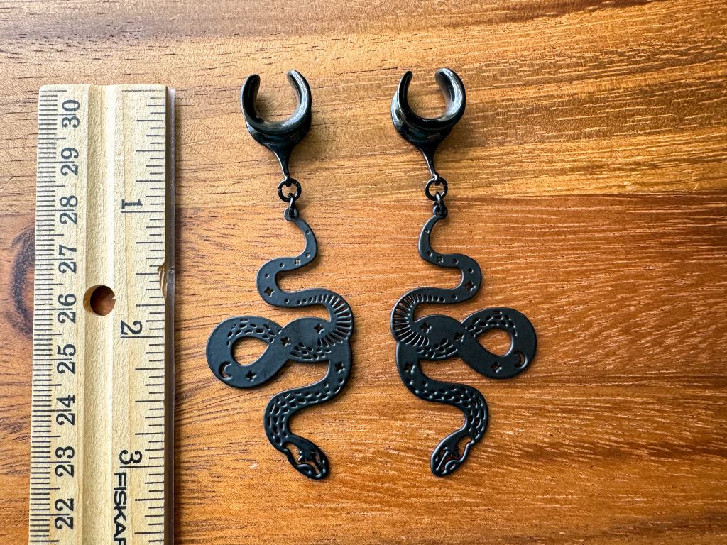 2g (6mm) - 1 3/16 (30mm) Black Snakes Saddles Drop Dangle Earrings Gauges/Earplugs Plugs.