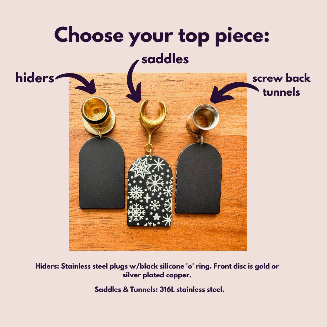 Regarding sizing: Saddles generally run bigger than expected. Why? The size you choose refers to the wearable (inner) area of the saddle where your lobe rests. However, saddles have larger outer widths and heights than typical plugs to help them stay in place- very similar to double flared plugs. See second photo for reference. We ask you keep this in mind when selecting a size as these larger outer areas may be a challenge for some to insert properly. Some may prefer a more fitted look or are intending on continuing their stretching journey while others may want a more looser fit, especially at larger lobe sizes.