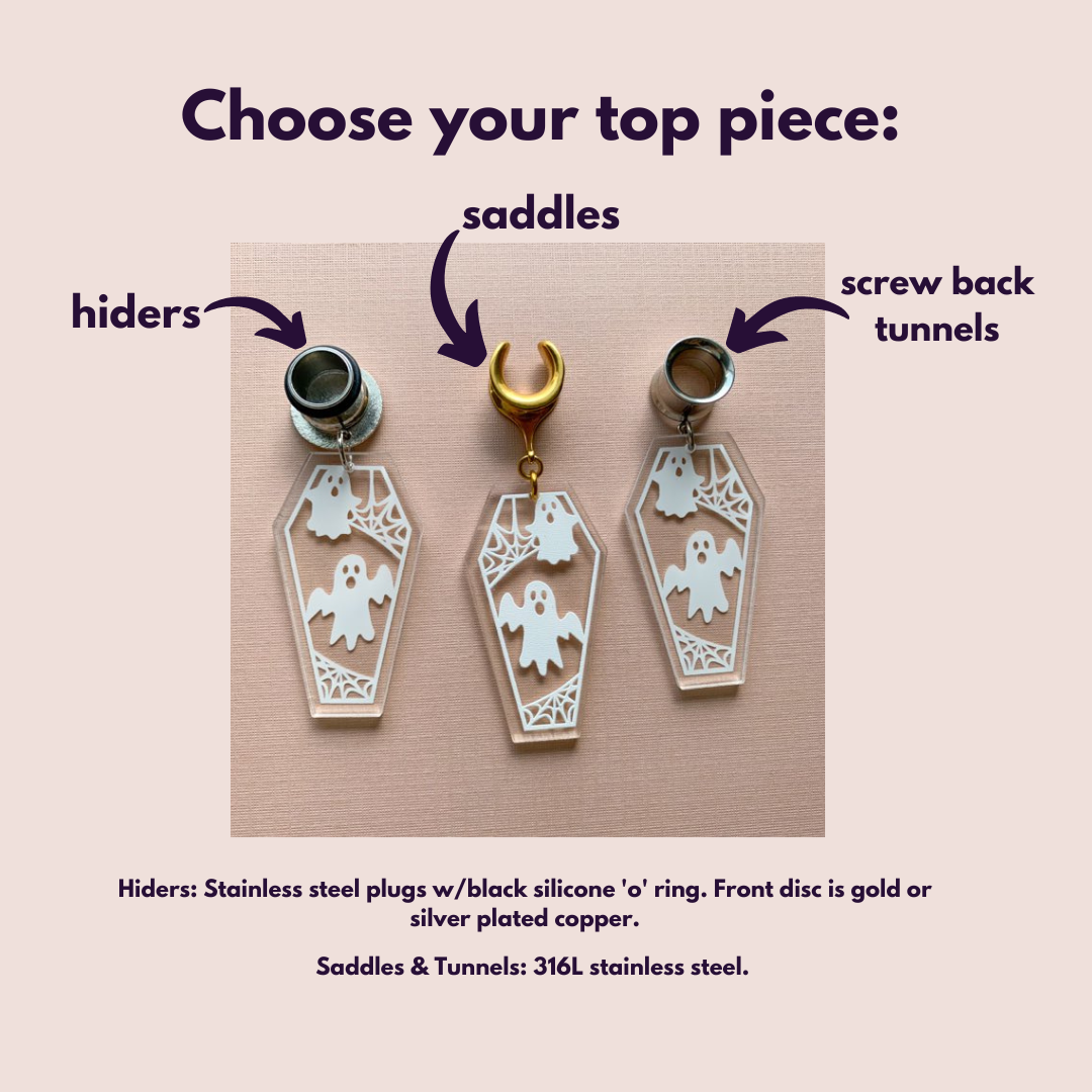 2g (6mm) - 1 3/16 (30mm) Gold or Silver Clear Coffin Ghost Saddles Hiders Drop Dangle Earrings Gauges/Earplugs Plugs.