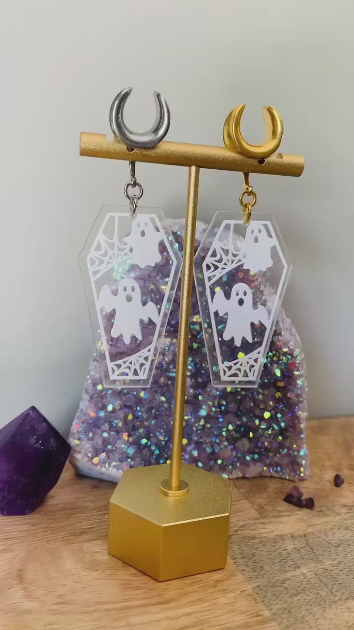 👻🌟 Unearth a touch of spooky charm with our clear coffin ghost scene earrings. Each earring showcases a miniature ghostly tableau within a crystal-clear coffin-shaped charm, creating a whimsical and eerie vibe perfect for Halloween or any day you want to embrace the supernatural.✨