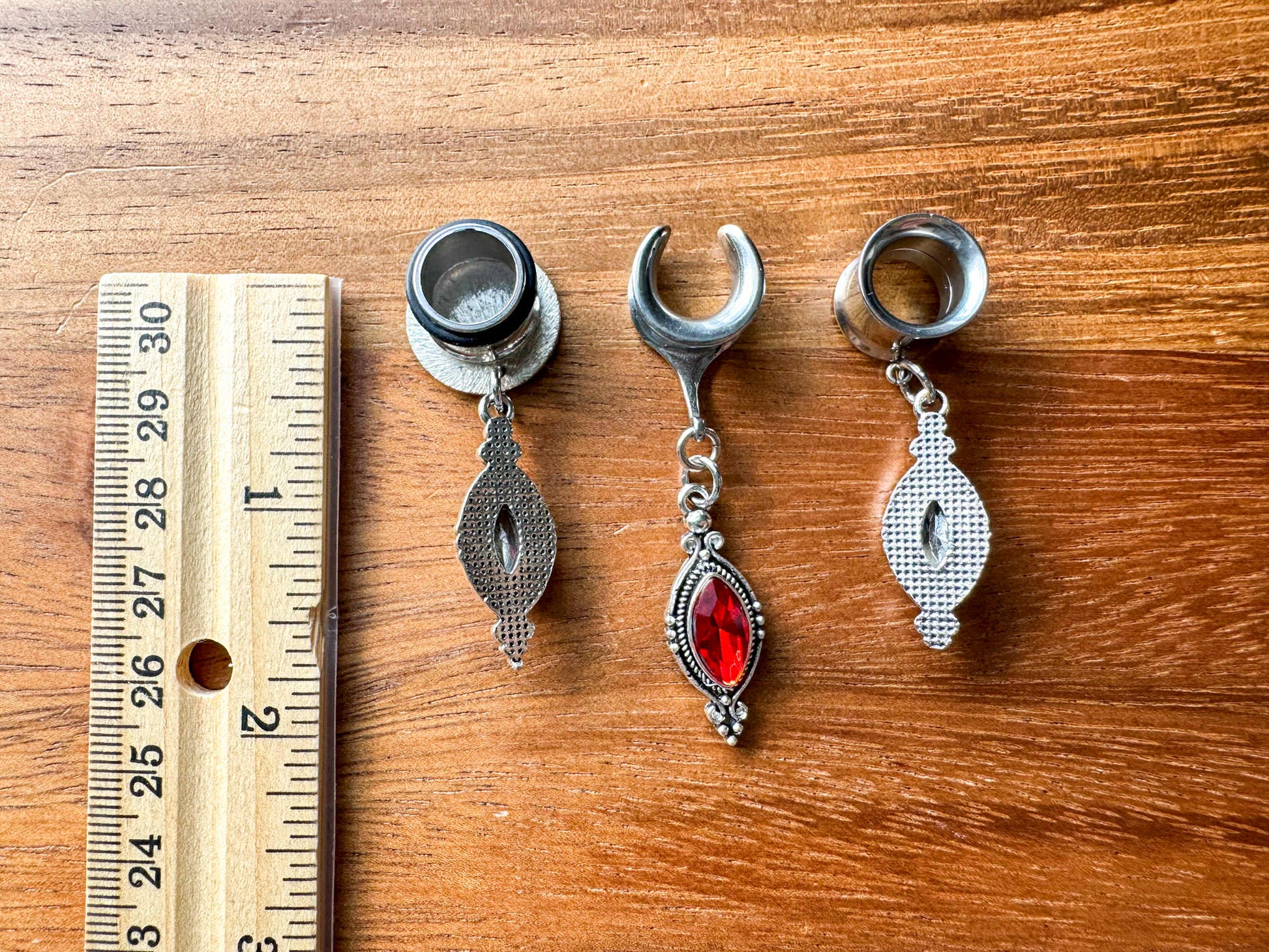 6g (4mm) - 1 3/16 (30mm) Crimson Red Antique Silver Saddles Hiders Drop Dangle Earrings Gauges/Earplugs Plugs.