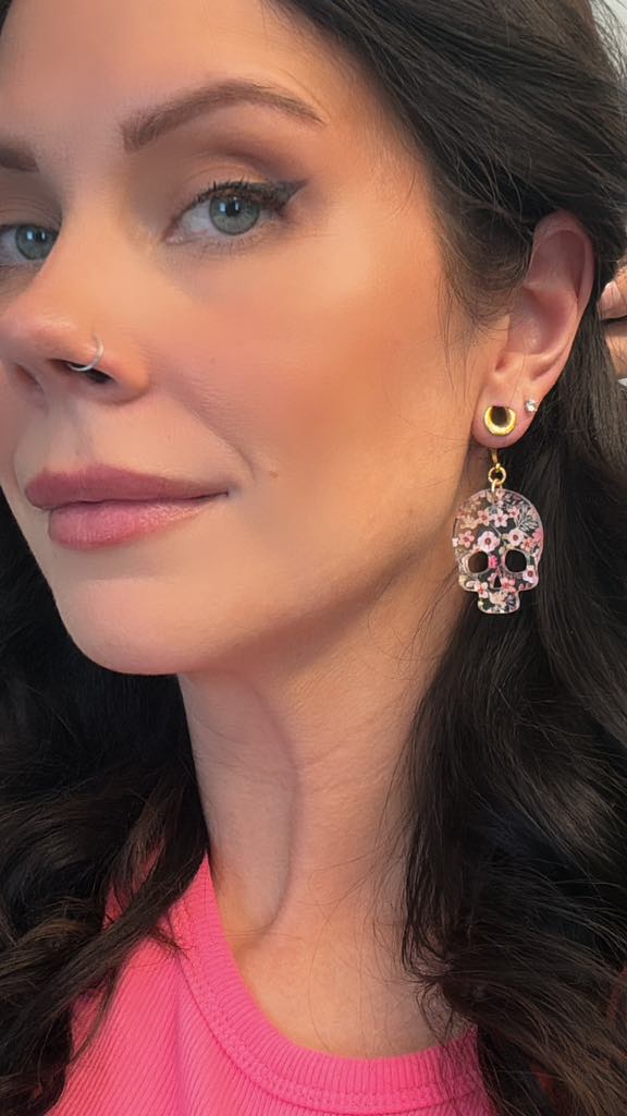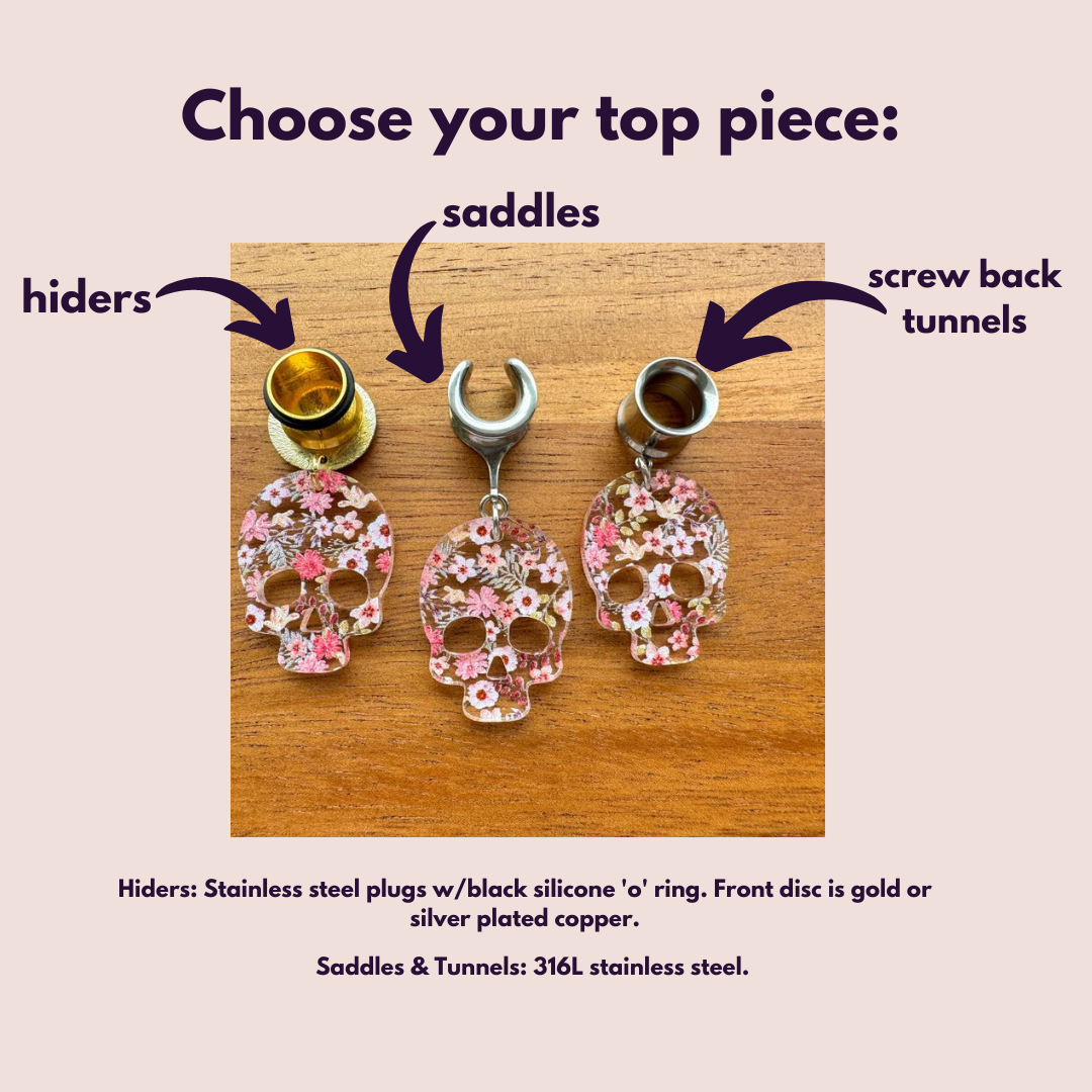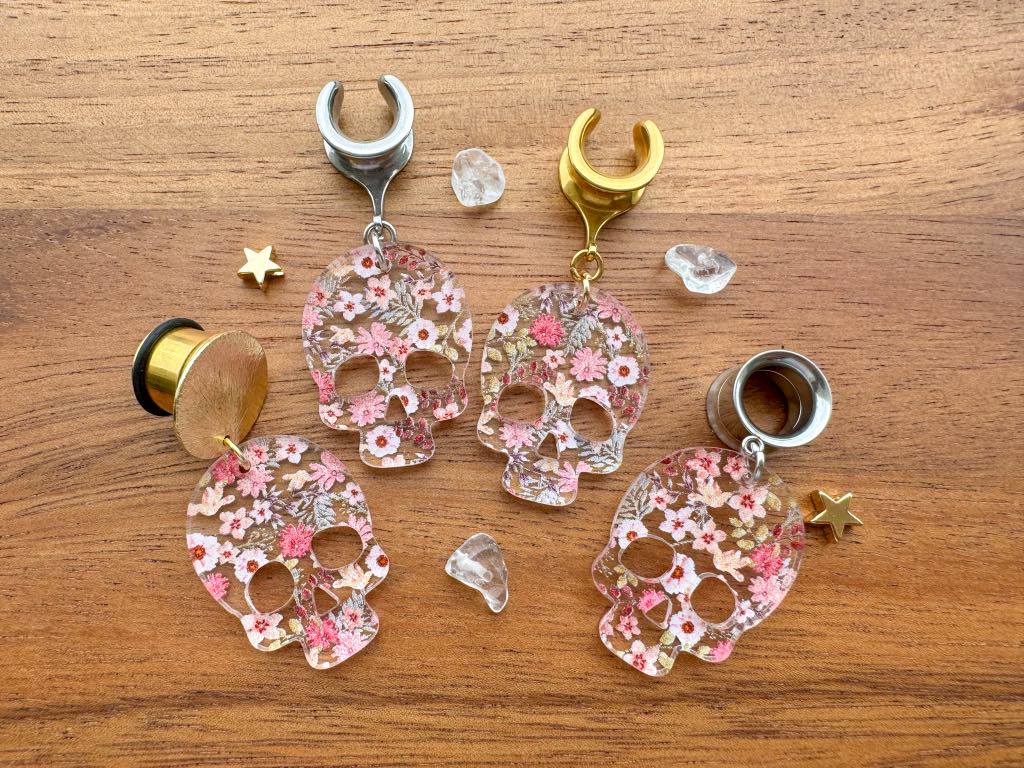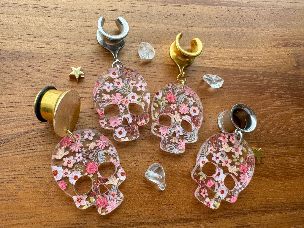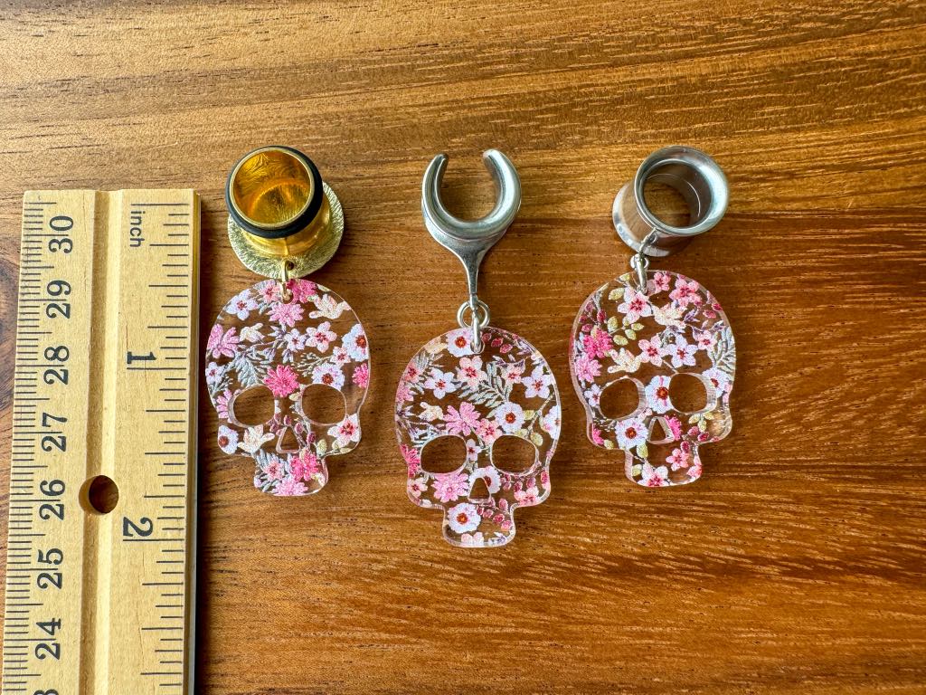 8g (3mm) - 1 3/16 (30mm) Floral Skulls Drop Dangle Earrings Gauges/Earplugs Hider Plugs.