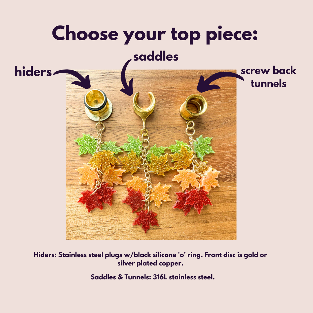 6g (4mm) - 1 3/16 (30mm) Glittery Maple Leaves Saddles Hiders Drop Earrings Gauges/Earplugs Plugs.