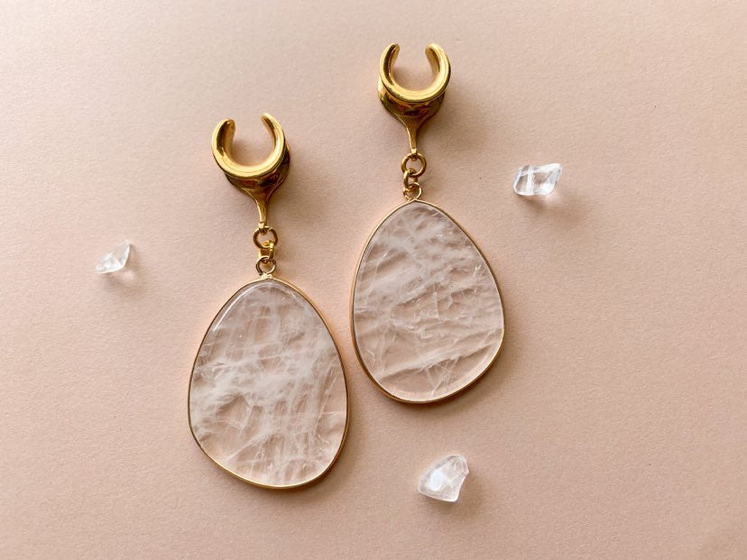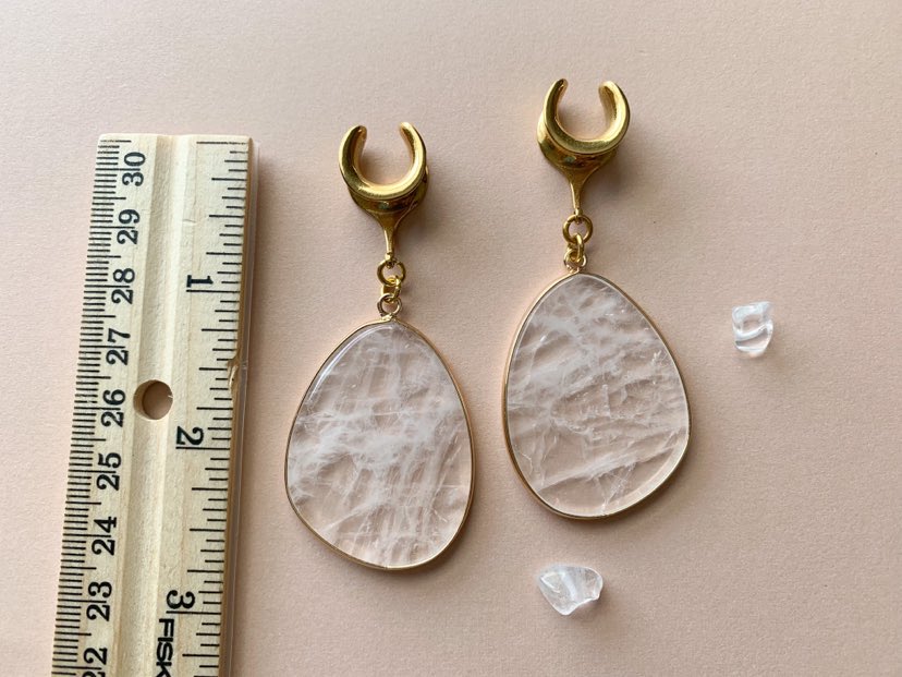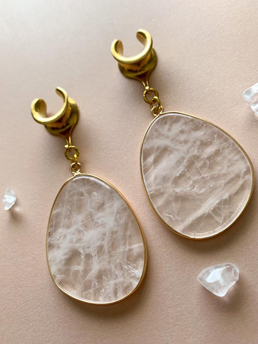 2g (6mm) - 1 3/16 (30mm) Gold Clear Quartz Slice Saddles Hiders Drop Dangle Earrings Gauges/Earplugs Plugs.