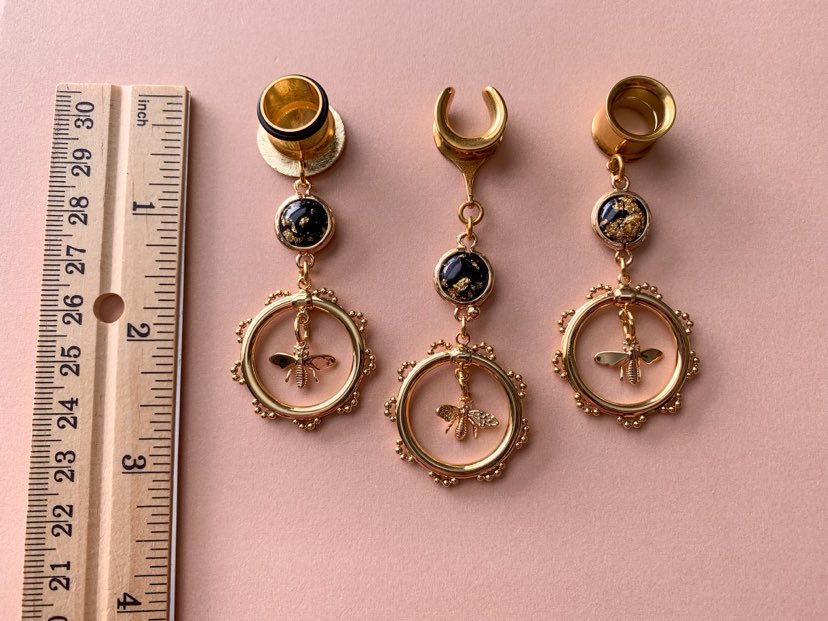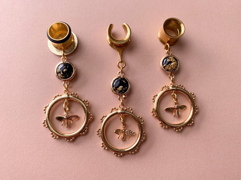 -Your choice of top portion: hider, saddle or screw back tunnels.-Features gold foiled black glass connector, 18k gold plated detailed hoop and 24k gold bee.