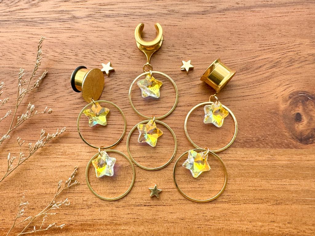6g (4mm) - 1 3/16 (30mm) Double Hoop and Reflective Stars Saddles Hiders Drop Dangle Earrings Gauges/Earplugs Plugs.