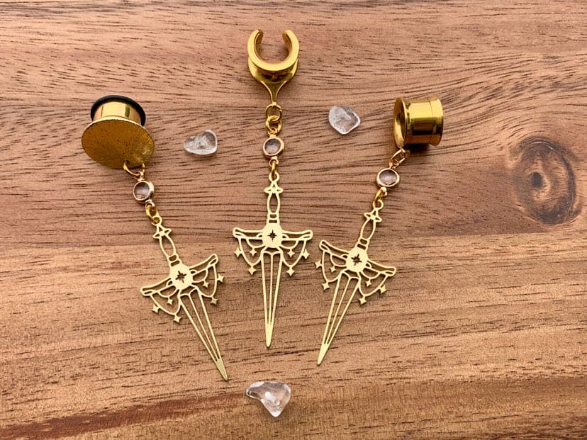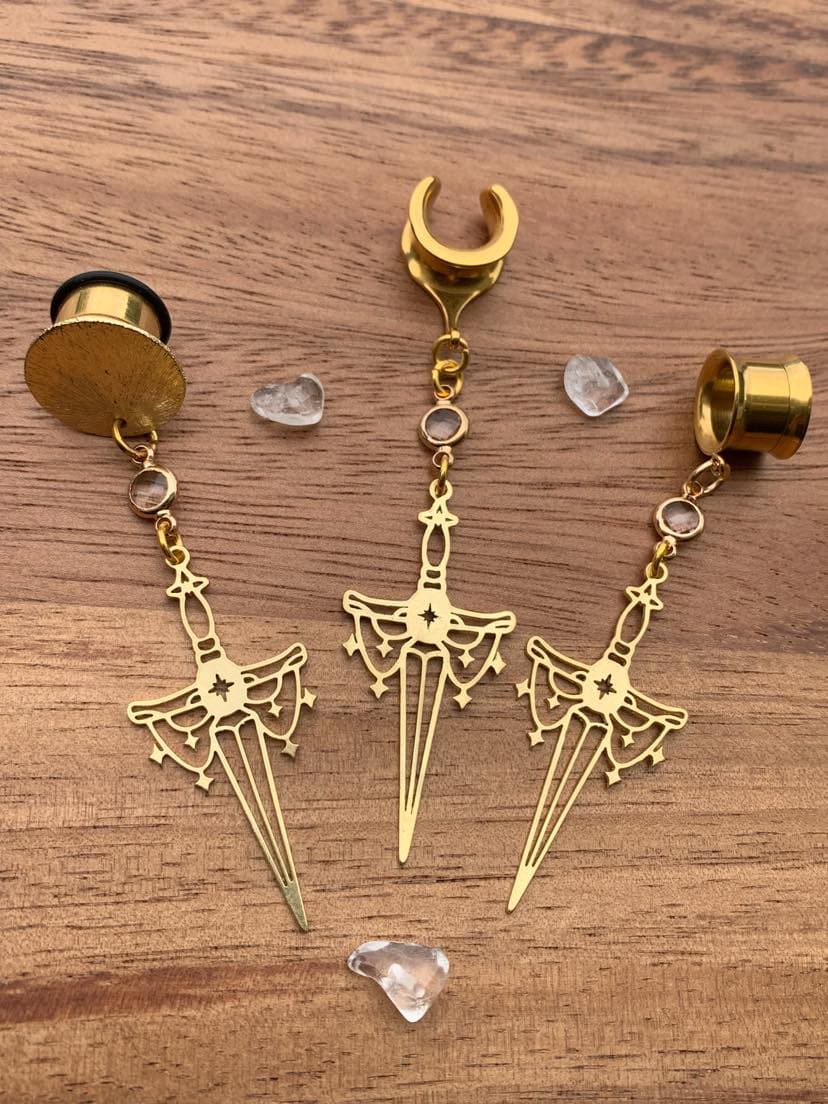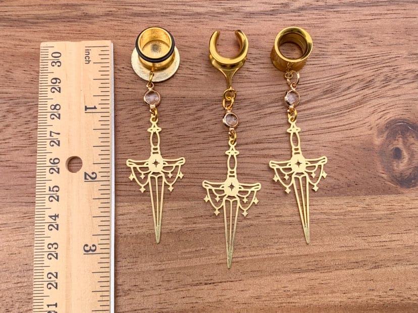 -Features celestial brass sword with clear glass connector.