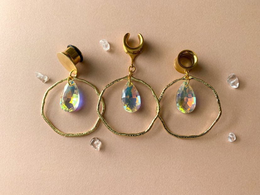 8g (3mm) - 1 3/16 (30mm) Gold Hoop w/ Reflective Tear Jewel Lightweight Drop Dangle Earrings Gauges/Earplugs Hider Plugs.