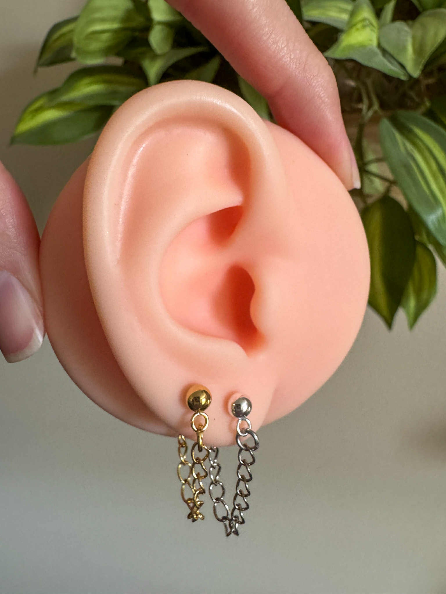 -24k gold plated stainless steel ball post with 24k gold plated brass chain. Post is roughly 15mm in length. Sold in pairs.