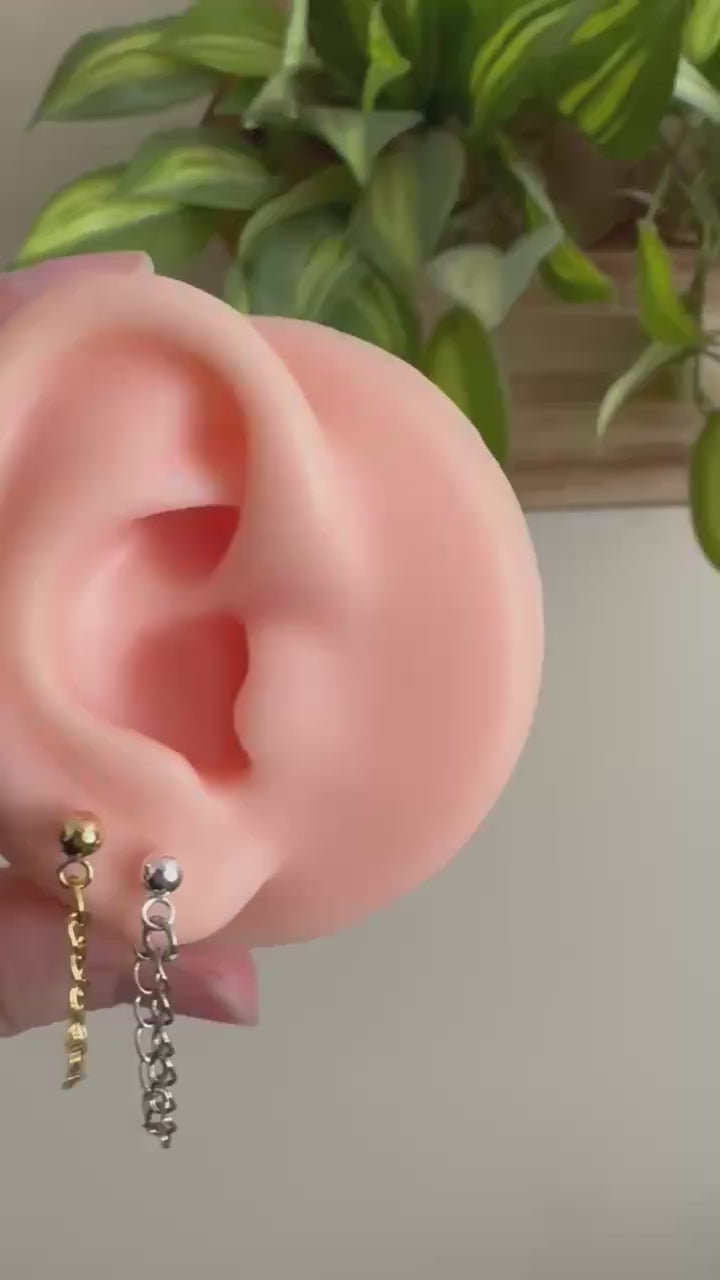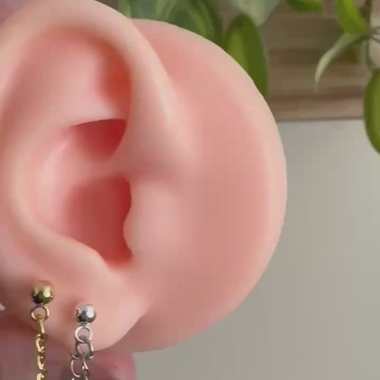 -Silver plated stainless steel ball post with rhodium plated brass chain. Post is roughly 15mm in length. Sold in pairs.