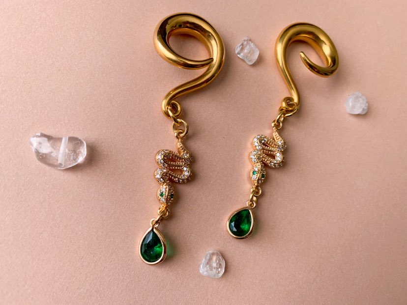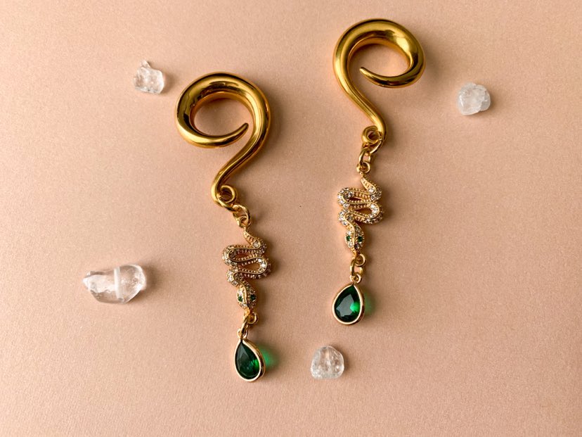 6g 2g 0g 00g Gold Zircon Snake w/ Green Glass Jewel Ear Hooks Lightweight Drop Dangle Earrings Gauges/Earplugs Plugs.