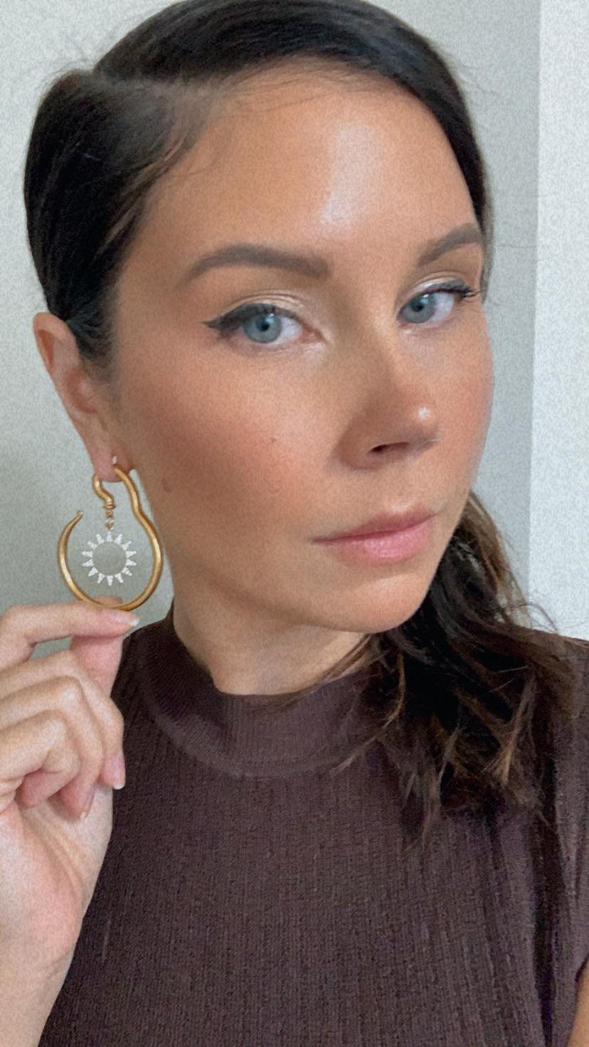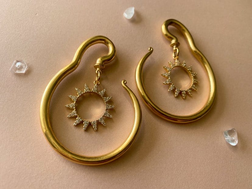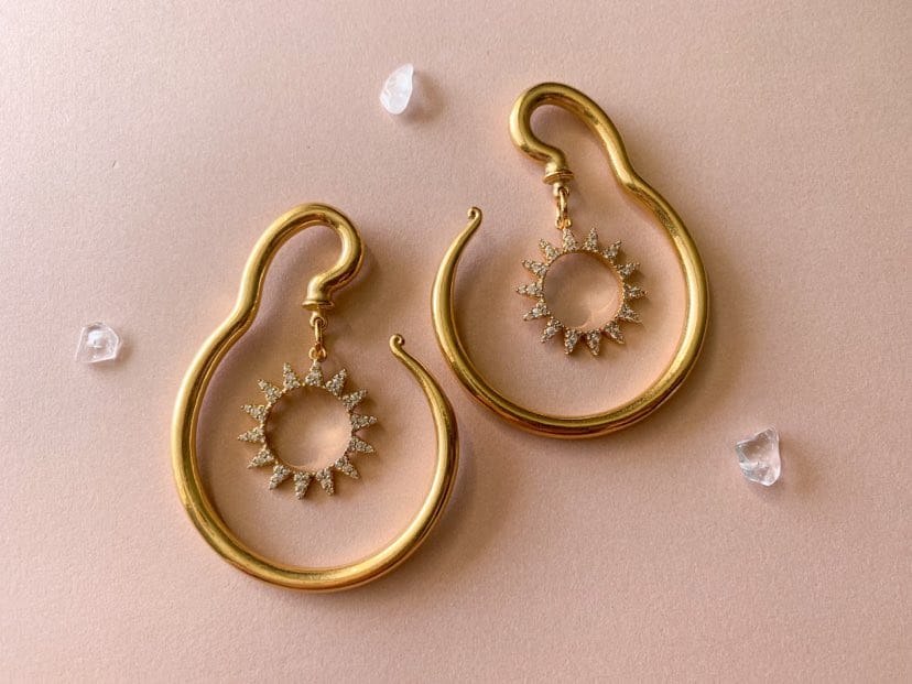 Gold Steel Spiral Hangers w/ 18k Gold CZ Sun Plugs Earrings.