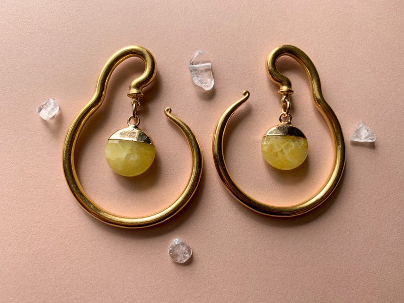 Gold Steel Spiral Hangers w/Polished Yellow Jade Charm Plugs Earrings.