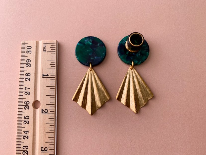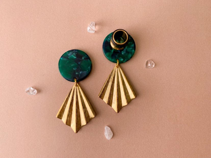 4g (5mm) - 5/8 (16mm) Green Marble Acetate w/Gold Fan Lightweight Hoop Drop Dangle Earrings Gauges/Earplugs Hider Plugs.