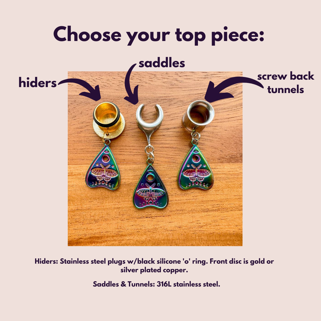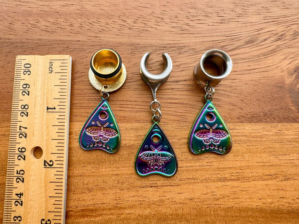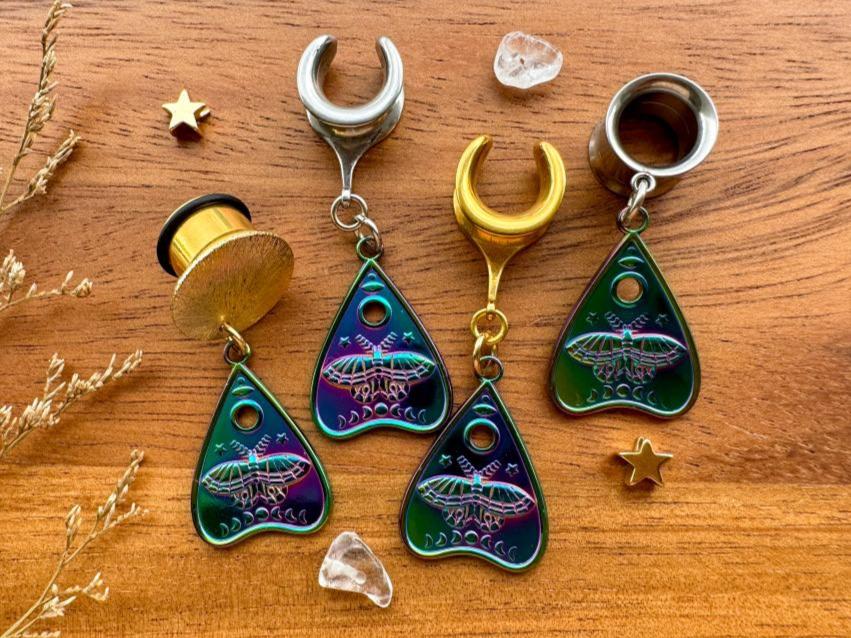 6g (4mm) - 1 3/16 (30mm) Rainbow Metal Moth Planchette Saddles Hiders Drop Dangle Earrings Gauges/Earplugs Plugs.