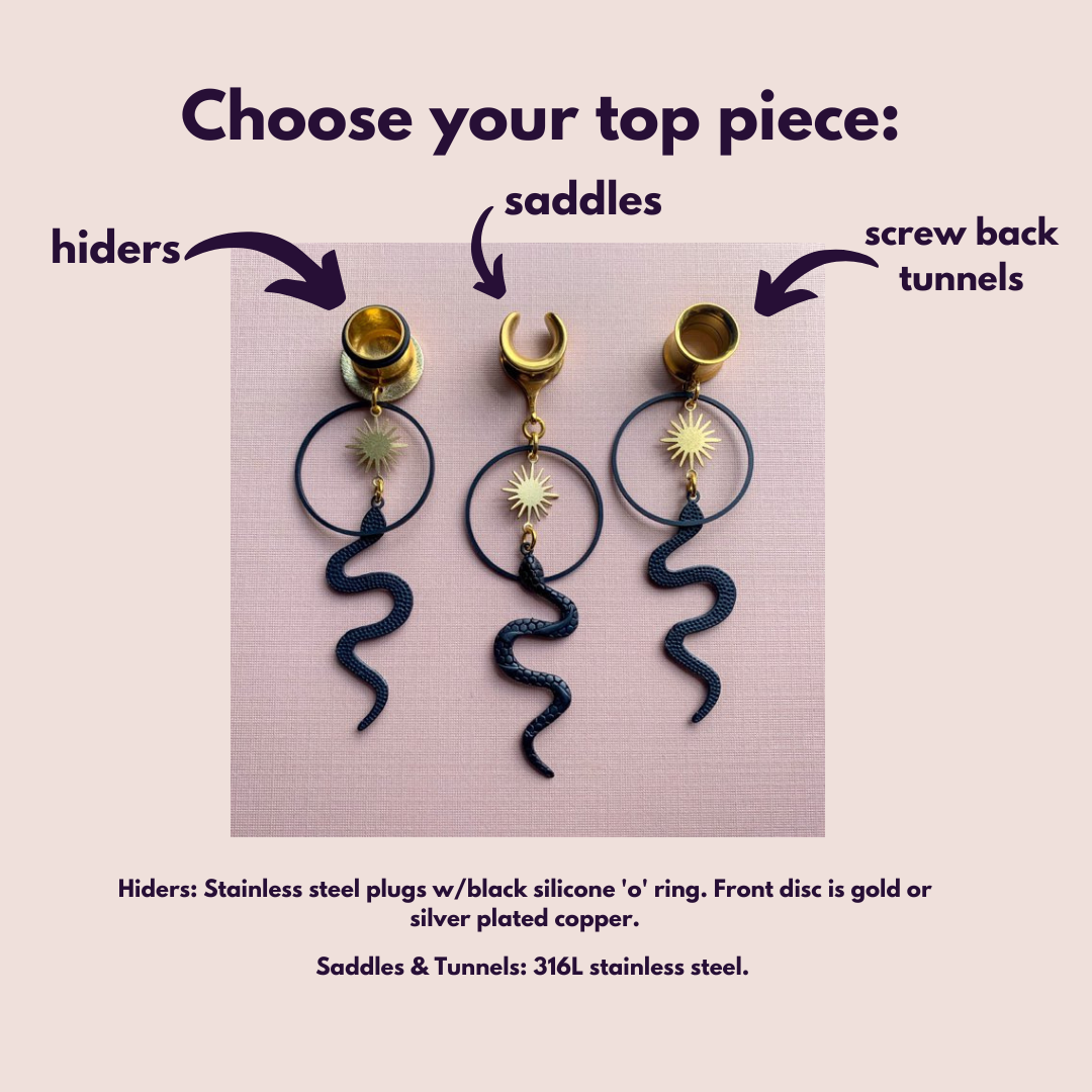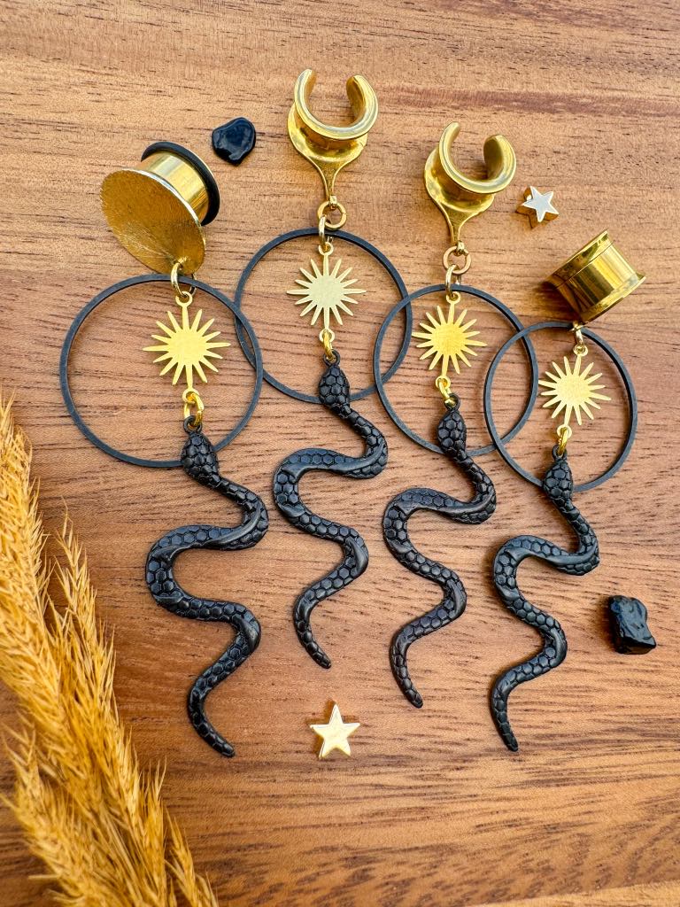 6g (4mm) - 1 3/16 (30mm) Gold and Black Snake Saddles Hiders Drop Dangle Earrings Gauges/Earplugs Plugs.