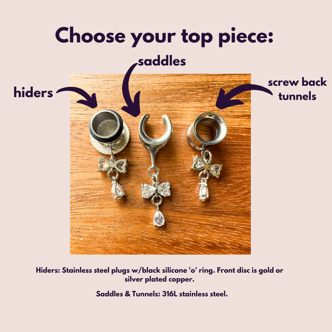Regarding sizing: Saddles generally run bigger than expected. Why? The size you choose refers to the wearable (inner) area of the saddle where your lobe rests. However, saddles have larger outer widths and heights than typical plugs to help them stay in place- very similar to double flared plugs. See second photo for reference. We ask you keep this in mind when selecting a size as these larger outer areas may be a challenge for some to insert properly. Some may prefer a more fitted look or are intending on continuing their stretching journey while others may want a more looser fit, especially at larger lobe sizes.