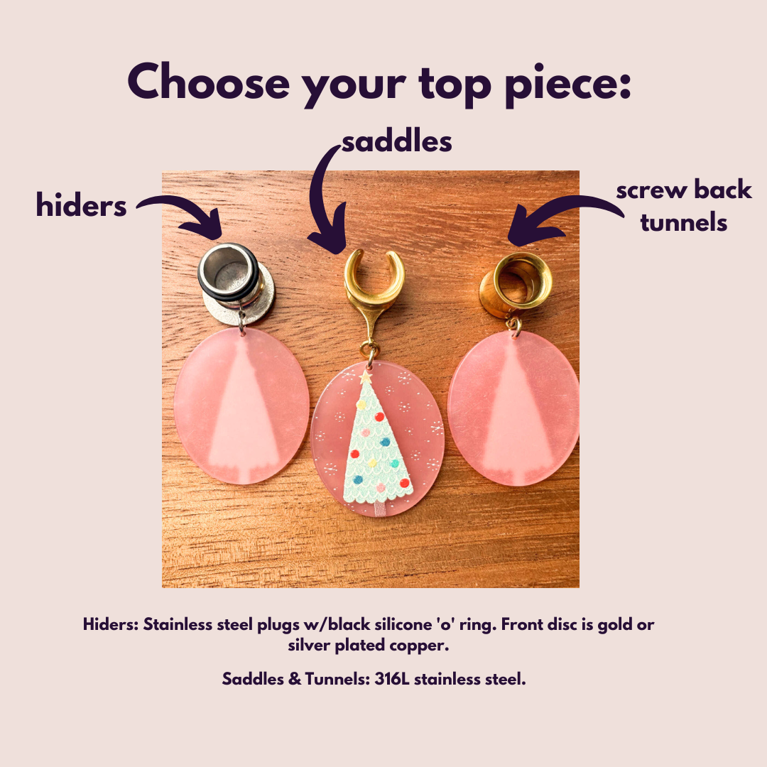 6g (4mm) - 1 5/16" (34mm) Oval Pink Christmas Tree Saddles Hiders Dangle Earrings Gauges Plugs.