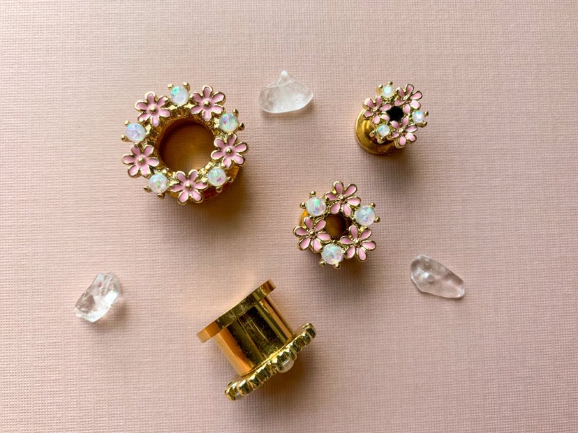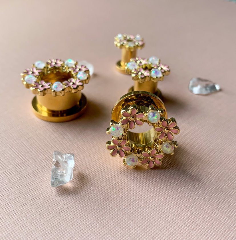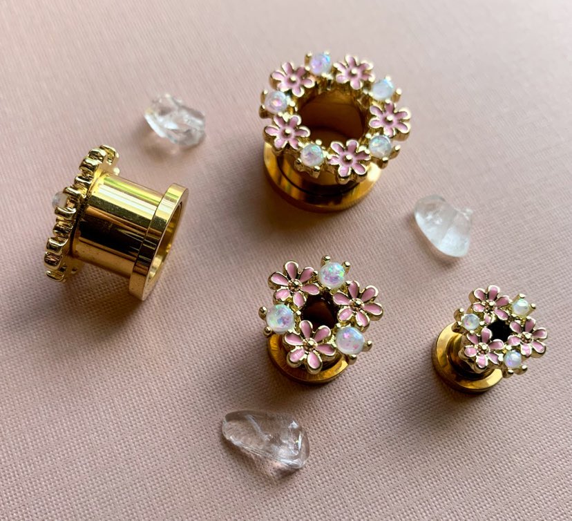 -316L surgical steel screw fit plugs featuring pink enamel flowers and opalites.