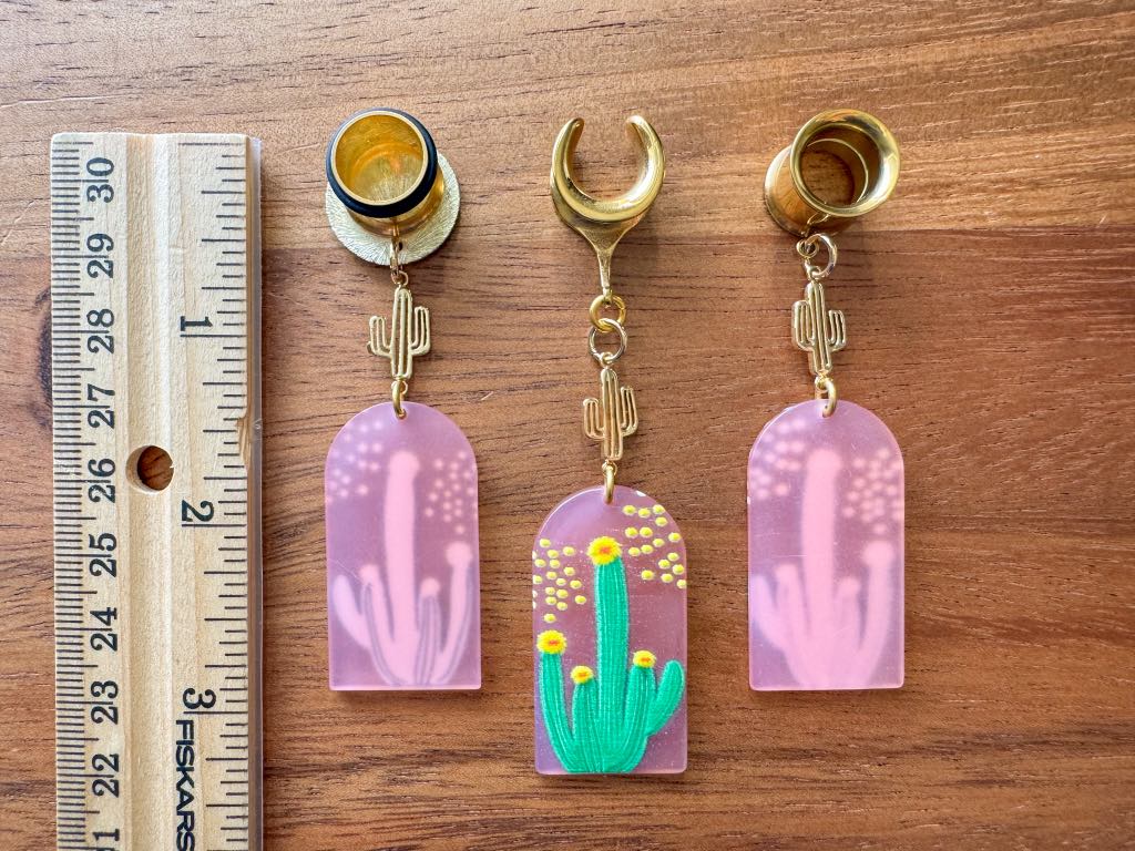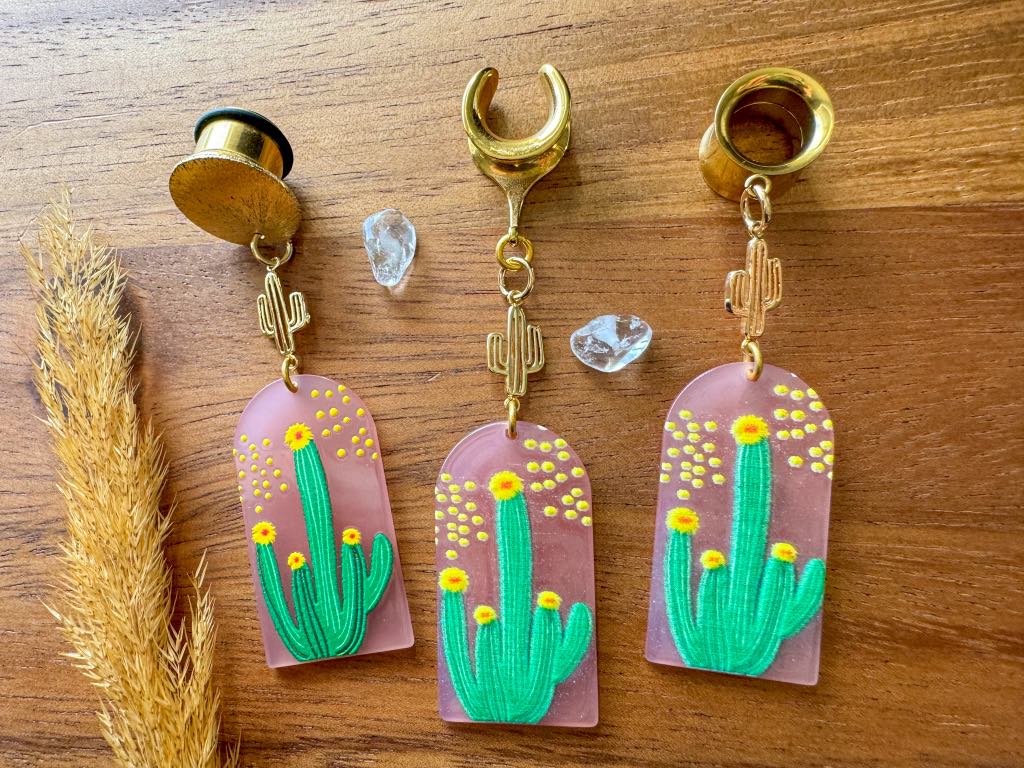 2g (6mm) - 1 3/16 (30mm) Long Pink Flowering Cactus w/ Mini 18k Gold Cactus Lightweight Drop Dangle Earrings Gauges/Earplugs Hider Plugs.
