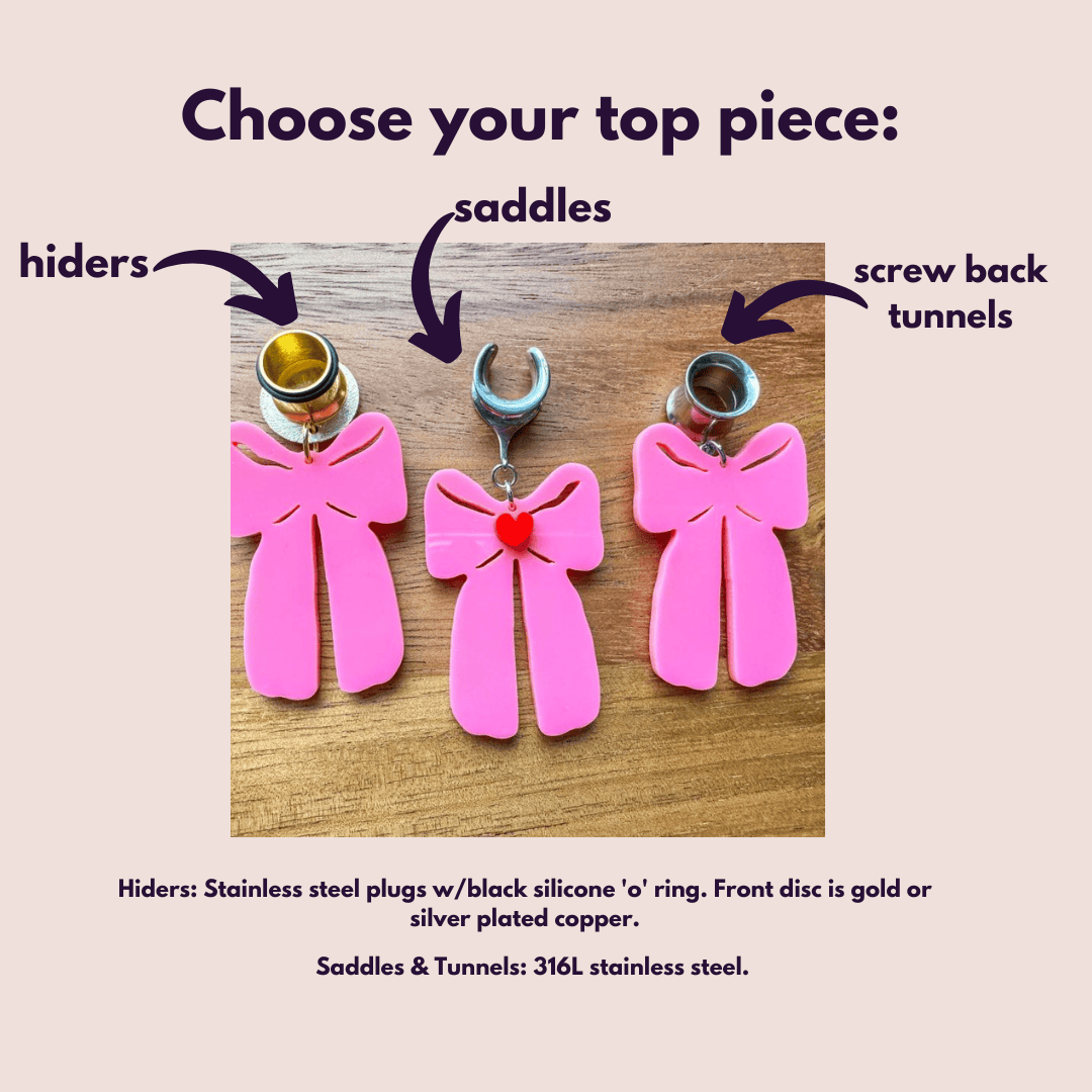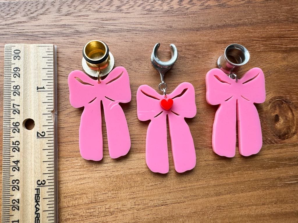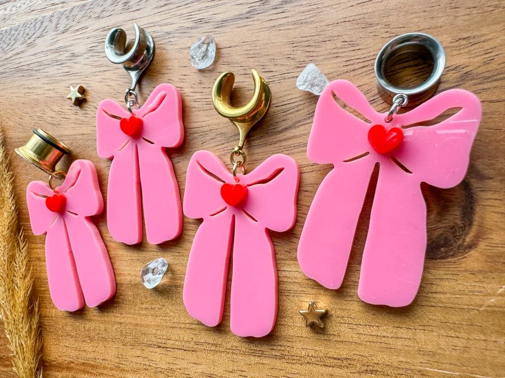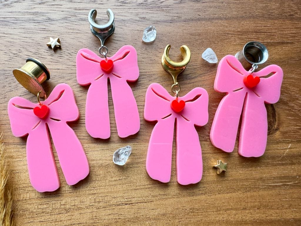 6g (4mm) - 1 3/16 (30mm) Pink and Red Bows Tunnels Hiders Drop Dangle Earrings Gauges/Earplugs Plugs.