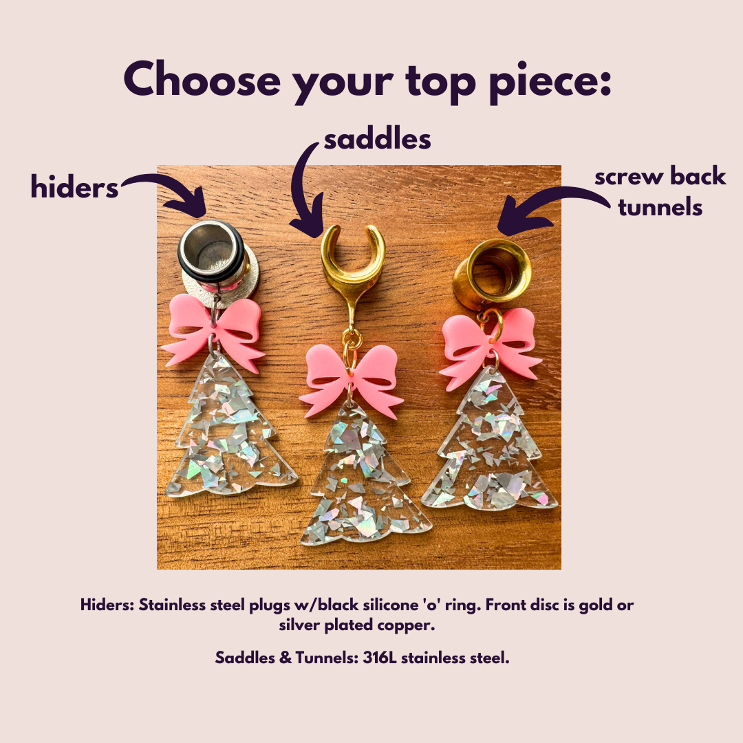 6g (4mm) - 1 5/16" (34mm) Pink and Silver Confetti Trees Dangle Earrings Gauges/Earplugs Hider Plugs.