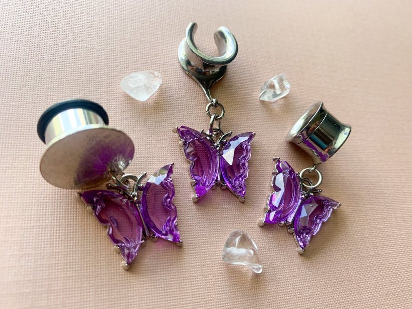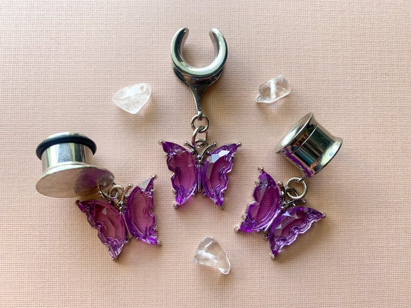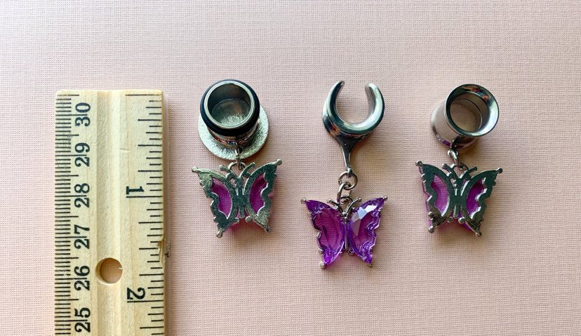 6g (4mm) - 1 3/16 (30mm) Purple And Silver Butterfly Saddles Drop Dangle Earrings Gauges/Earplugs Plugs.