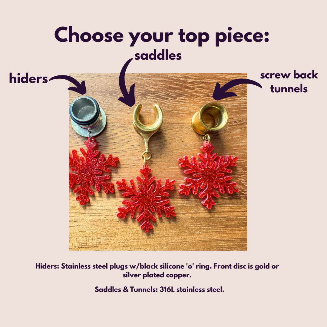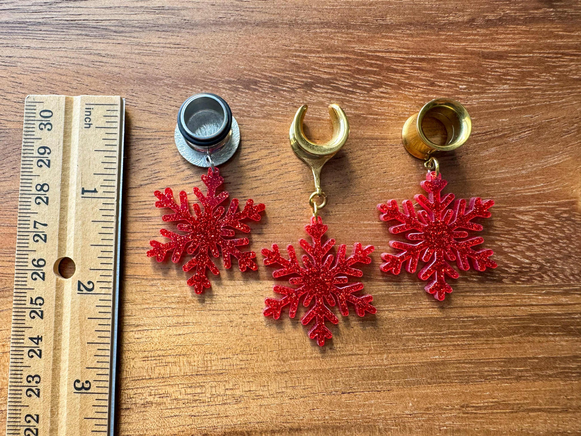 6g (4mm) - 1 5/16" (34mm) Red Glitter Snowflakes Saddles Hiders Gauges Tunnels Plugs.
