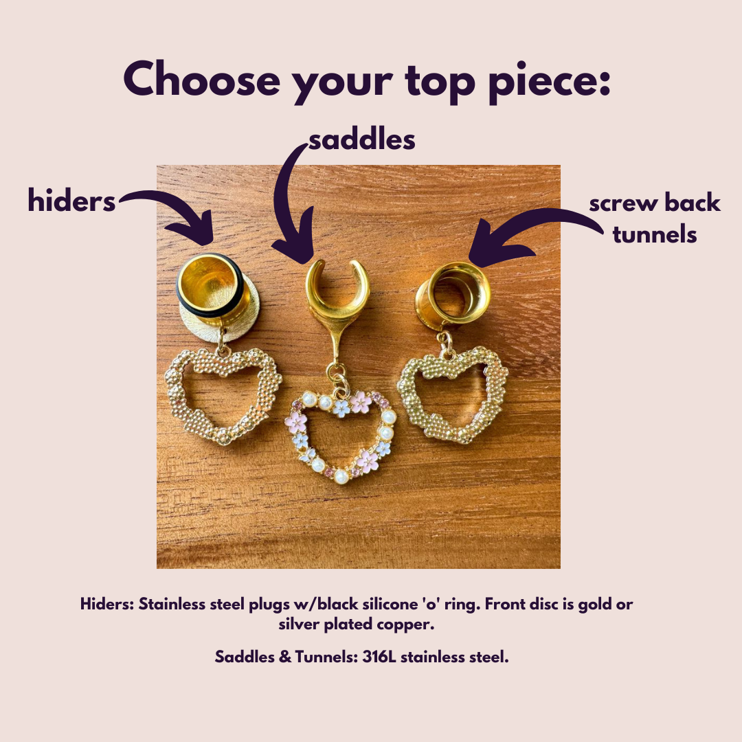 Regarding sizing: Saddles generally run bigger than expected. Why? The size you choose refers to the wearable (inner) area of the saddle where your lobe rests. However, saddles have larger outer widths and heights than typical plugs to help them stay in place- very similar to double flared plugs. See second photo for reference. We ask you keep this in mind when selecting a size as these larger outer areas may be a challenge for some to insert properly. Some may prefer a more fitted look or are intending on continuing their stretching journey while others may want a more looser fit, especially at larger lobe sizes.