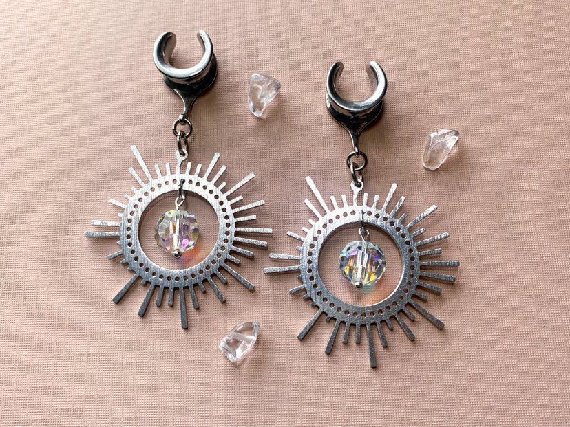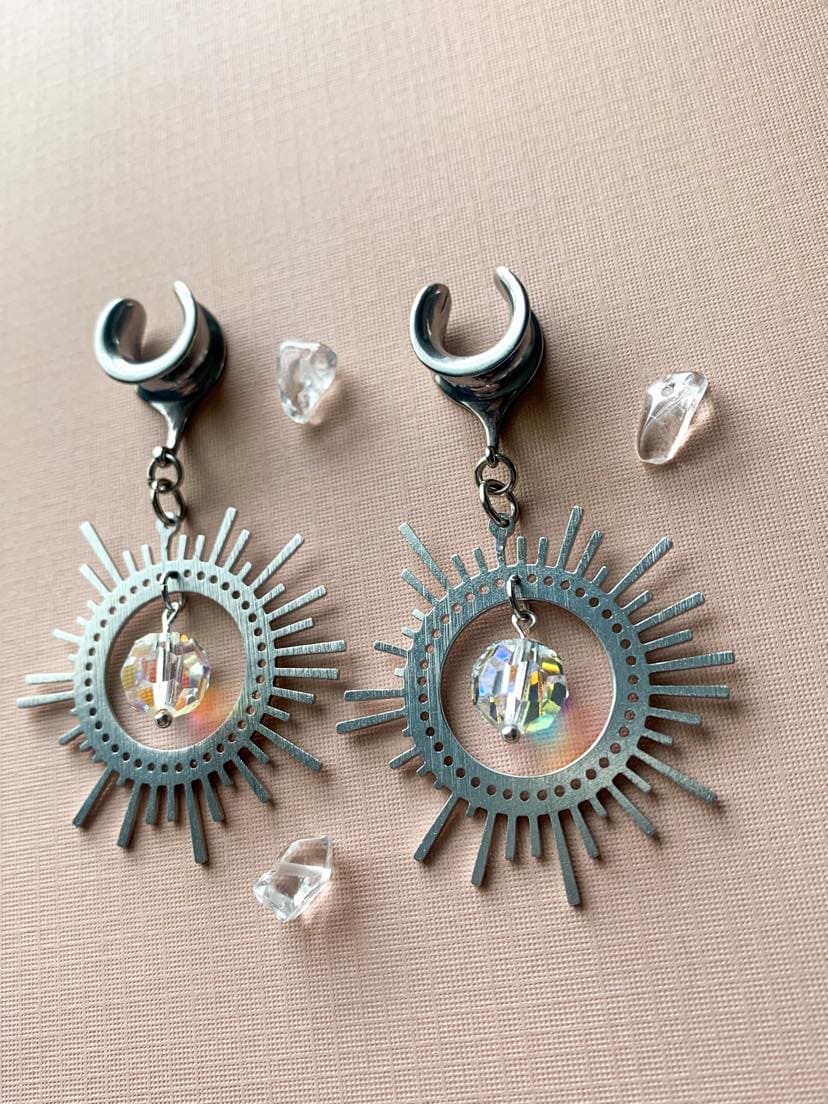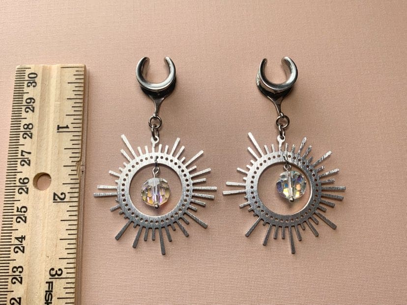 2g (6mm) - 1 3/16 (30mm) Silver Brushed Bejeweled Sun Saddles Drop Dangle Earrings Gauges/Earplugs Plugs.