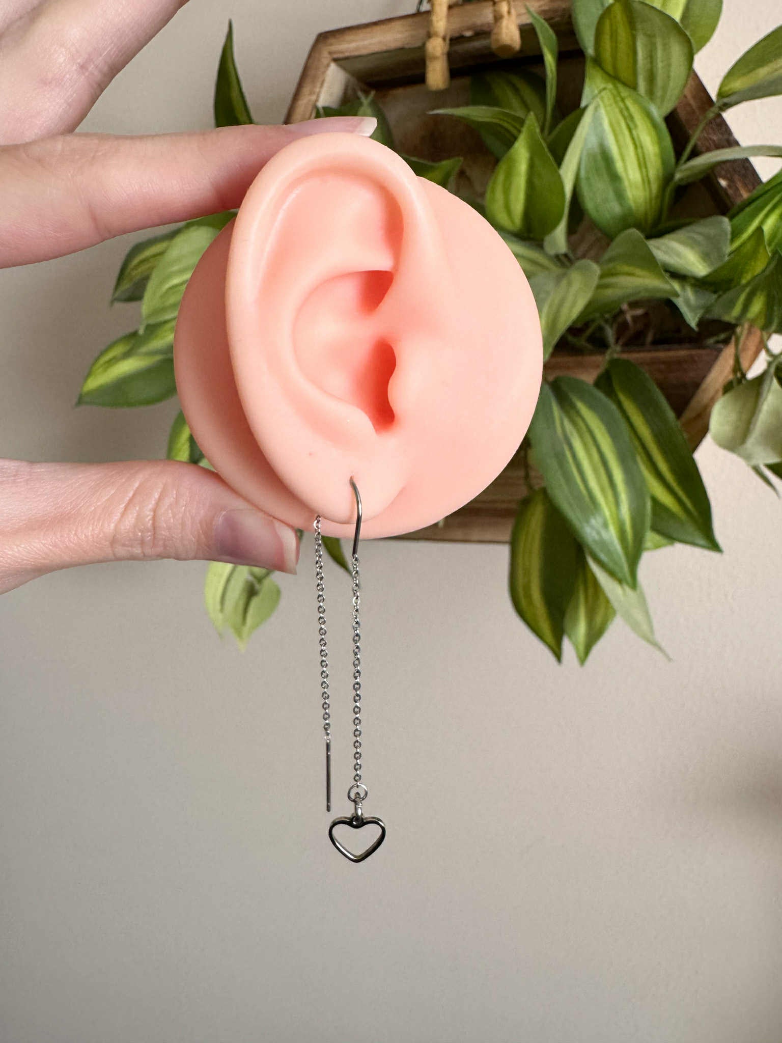 -Stainless steel threader earring with steel heart charm.
