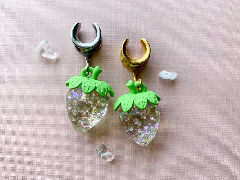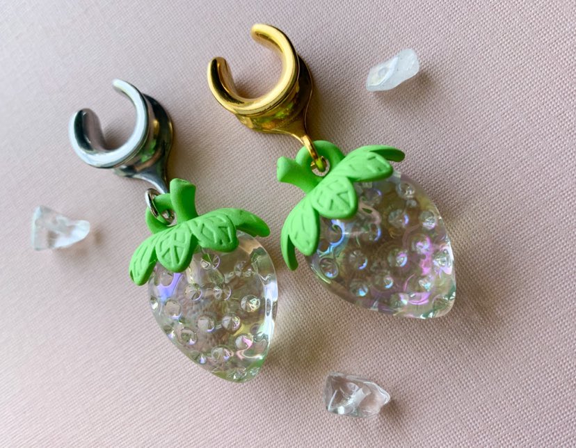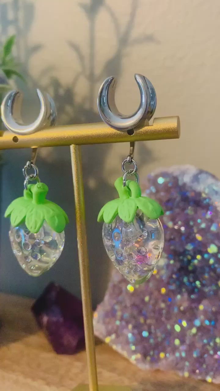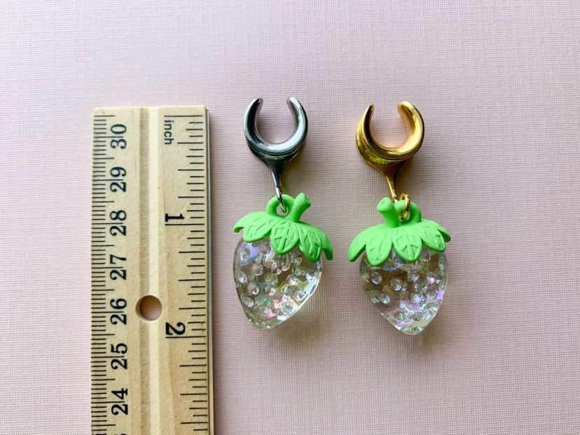 2g (6mm) - 1 3/16 (30mm) Silver or Gold Green and Iridescent Strawberry Saddles Drop Dangle Earrings Gauges/Earplugs Plugs.