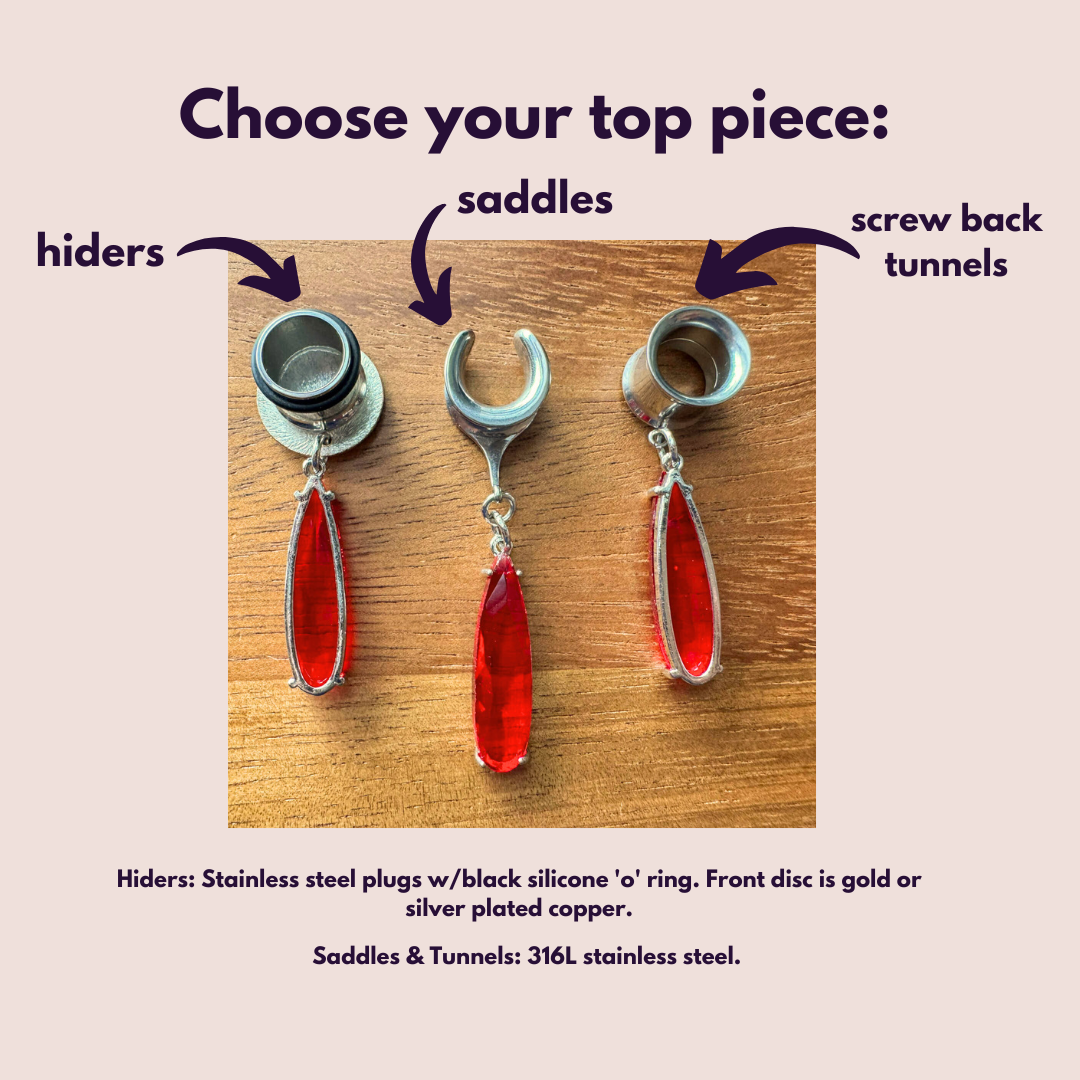 6g (4mm) - 1 5/16" (34mm) Silver and Red Elegant Tear Saddles Hiders Dangle Earrings Gauges Plugs.