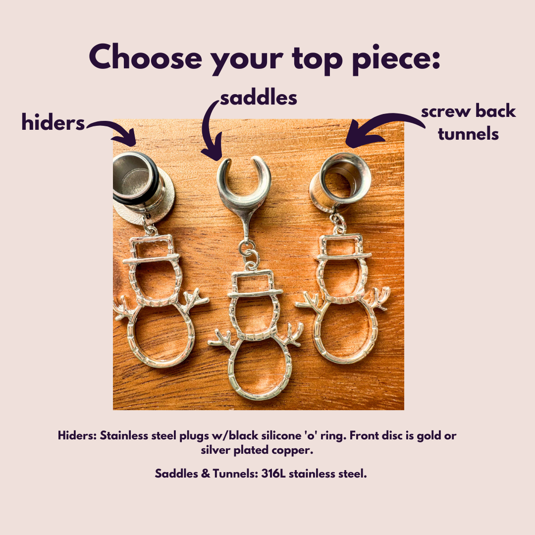 6g (4mm) - 1 3/16 (30mm) Silver Snowman Dangle Earrings Gauges/Earplugs Hider Plugs.