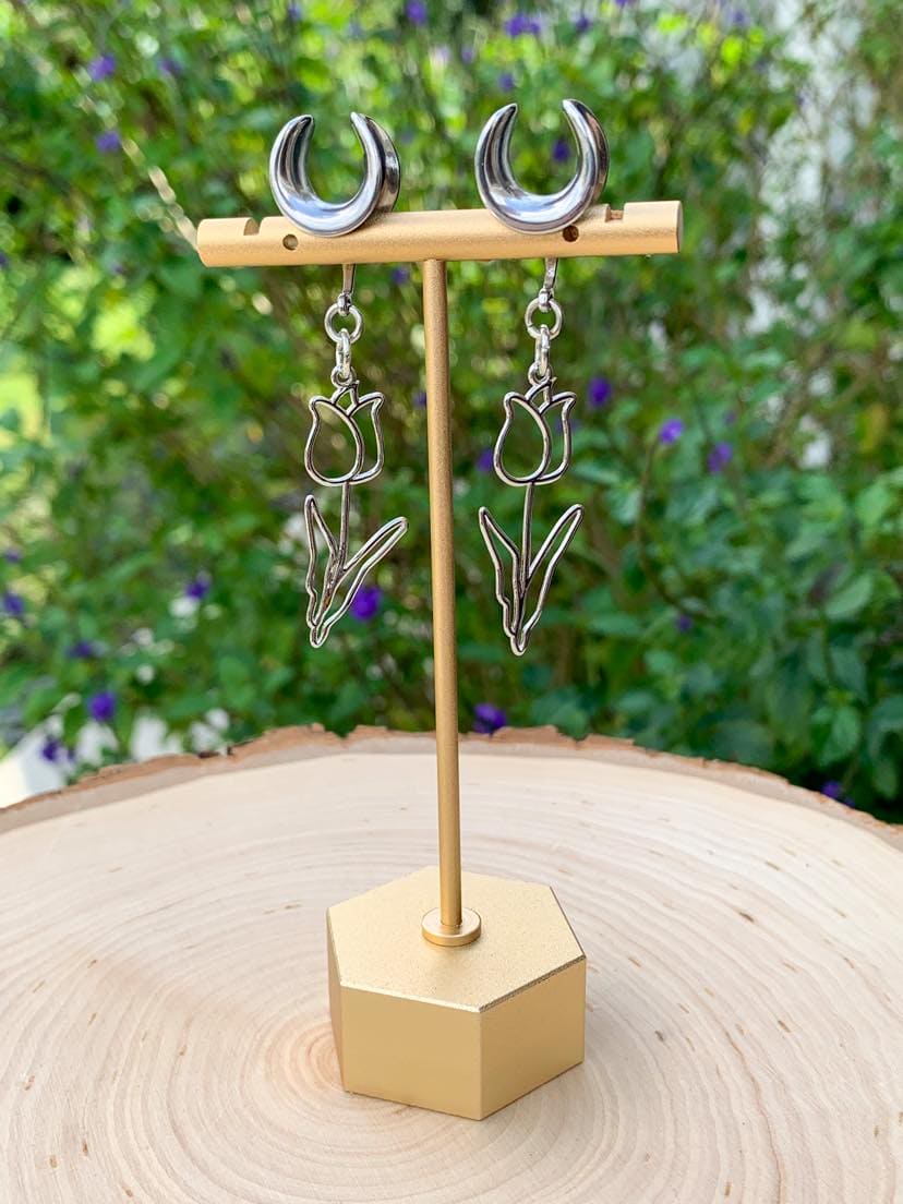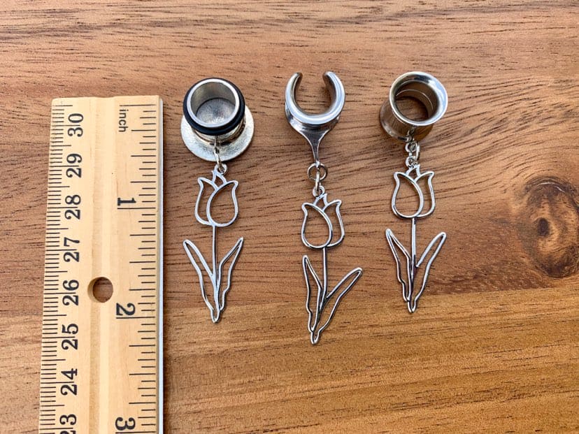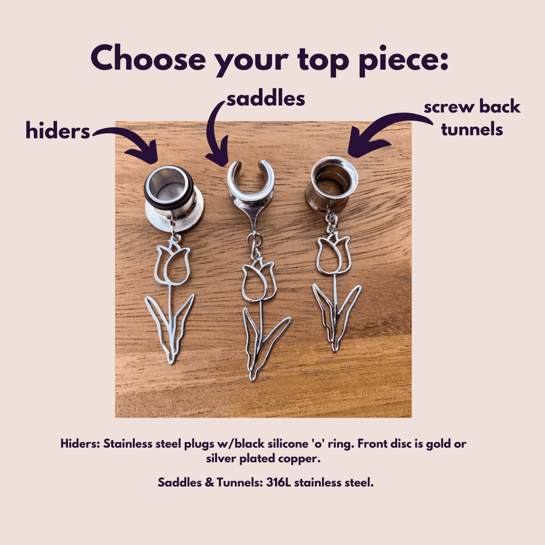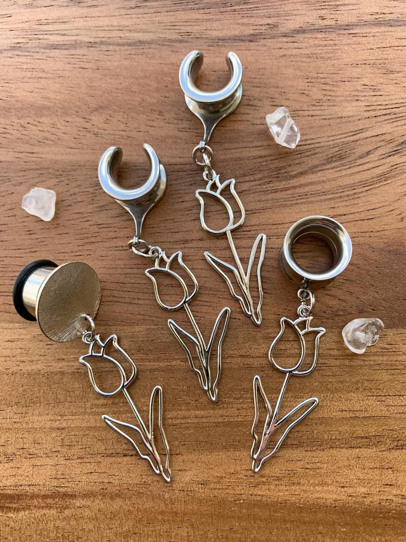 6g (4mm) - 1 3/16 (30mm) Silver Tulip Spring Flower Saddles Hiders Drop Dangle Earrings Gauges/Earplugs Plugs.