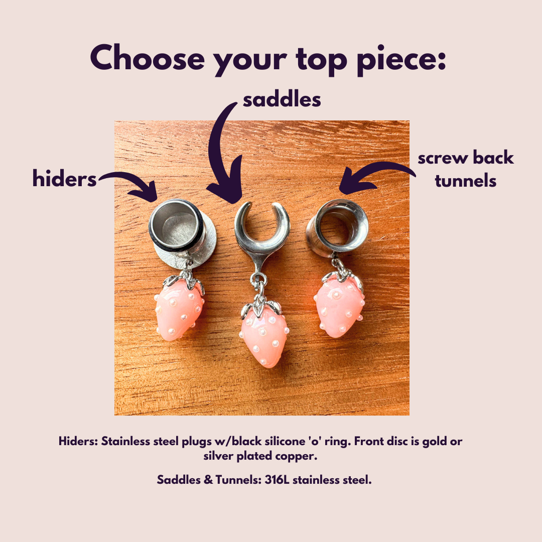 6g (4mm) - 1 5/16" (34mm) Small Pink Strawberries Hiders Saddles Dangle Earrings Gauges Plugs.