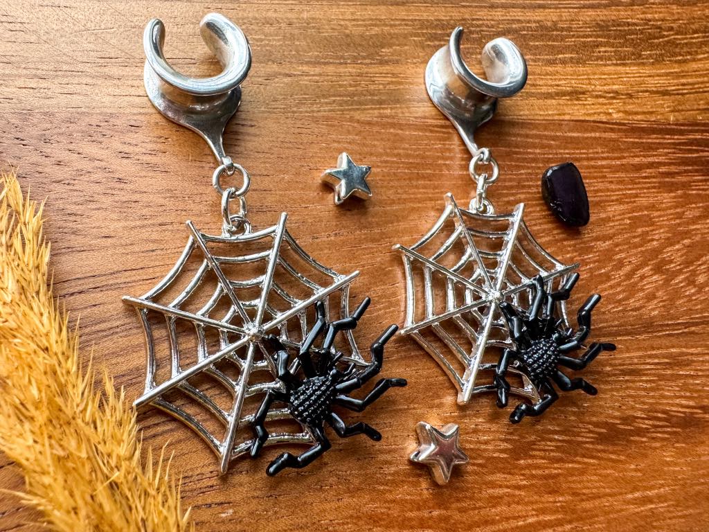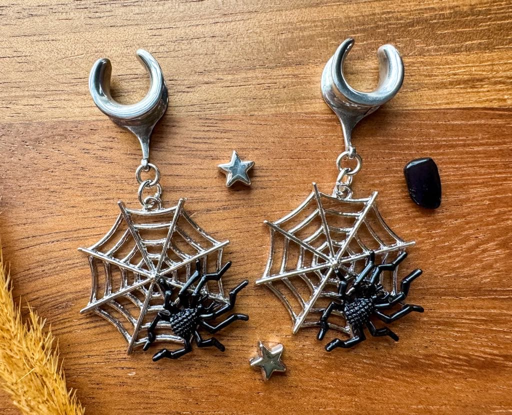 2g (6mm) - 1 3/16 (30mm) Silver Spider Webs Saddles Drop Dangle Earrings Gauges/Earplugs Plugs.