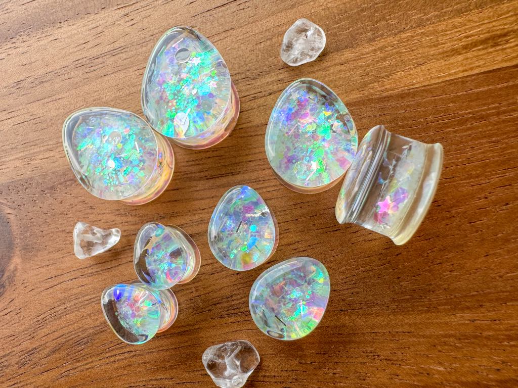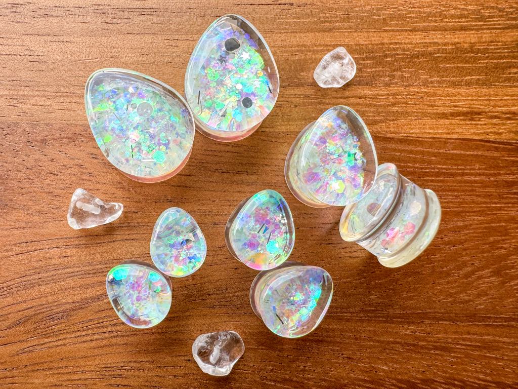 0g (8mm) - 3/4 (19mm) 'Stardust Glow' Iridescent Glitter Oval Acrylic Double Flare Plugs Gauges.
