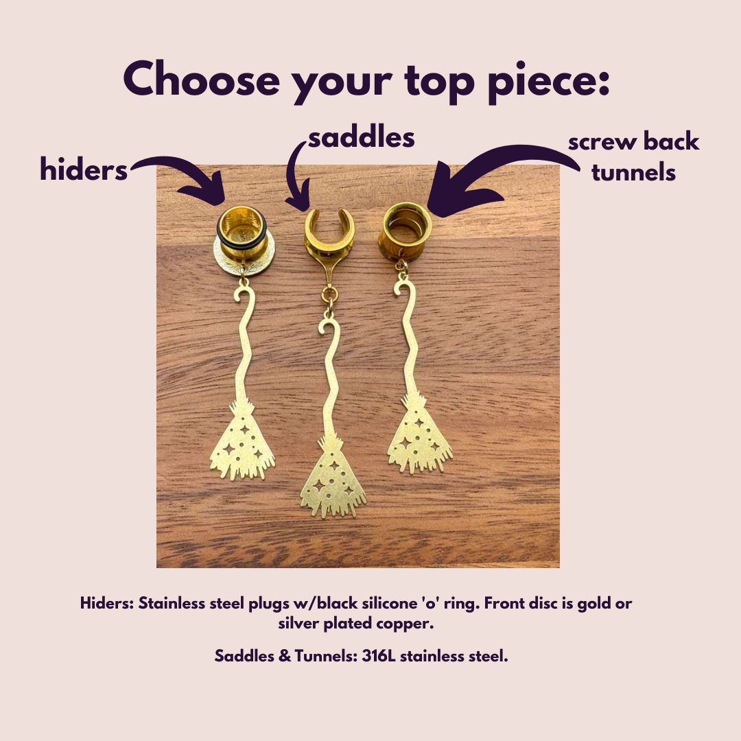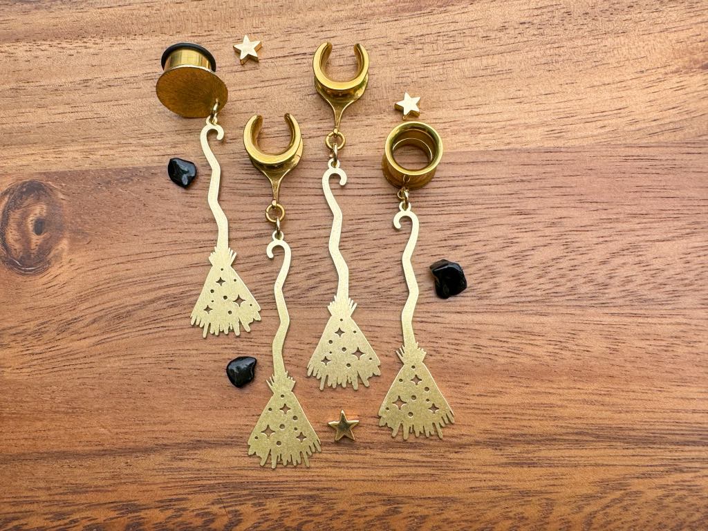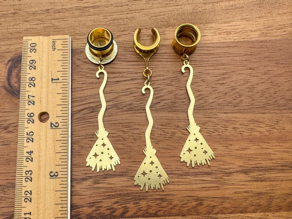 6g (4mm) - 1 3/16 (30mm) 'Witchy Ride' Brass Witches Broom Halloween Saddles Drop Dangle Earrings Gauges/Earplugs Plugs.